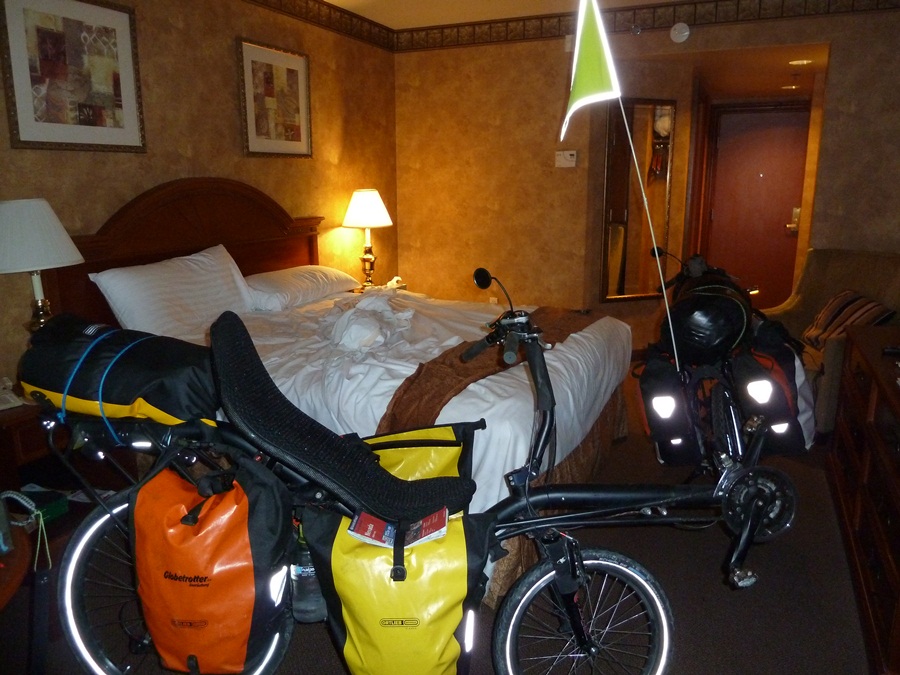 16h30, on sort de l’aéroport mais on est trop crevé pour remonter les vélos et enchainer la route jusqu’à l’hôtel. On craque donc pour le taxi qui n’est pas très cher ici. A l’hotel, on se débrouille pour monter discretement les vélos dans la chambre, ils ont rien vu. Je déballe et remonte les vélos pendant 2 heures, un vrai plaisir de bricoler les doigts plein de cambouis dans une belle chambre proprette, pendant qu’Ophélie lutte contre un coma profond dans le lit. Il est