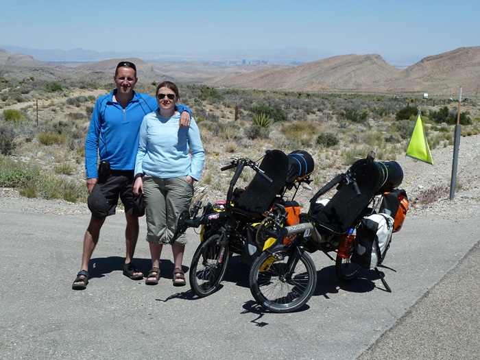 Nous sommes partis de l’hôtel de Las Vegas vers 8h et on s’est tapé une montagne à grimper (1 650m) en gros, pas loin des grands cols que l’on a fait en Septembre dernier en France. Pour notre première journée à vélo, ça a fait très mal aux cuisses!! Le plus dur : le soleil ! il tape hyper fort (30°c), nous avons beau nous protéger, cela n’a pas suffit pas ! On a quand même réussi à brûler : aux jambes, au cou et maintenant je ressemble à un Panda pour Fred et à un raton-laveur pour les américains qui nous reçoivent chez eux.