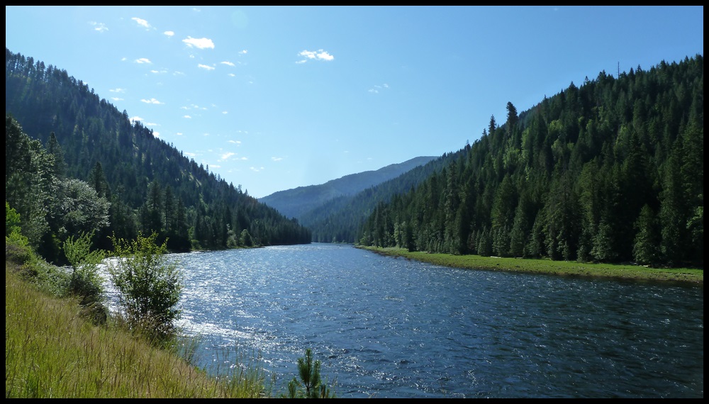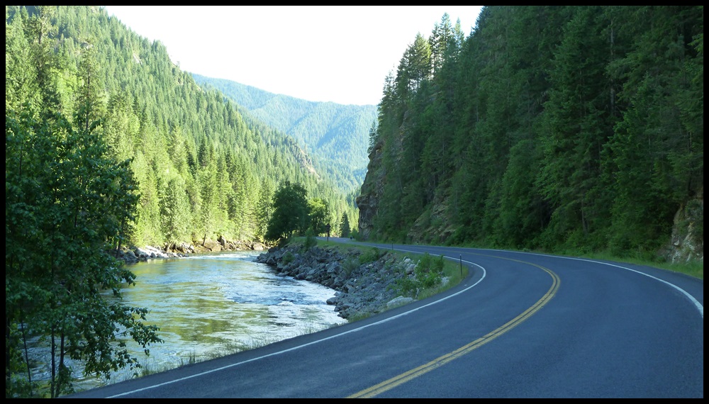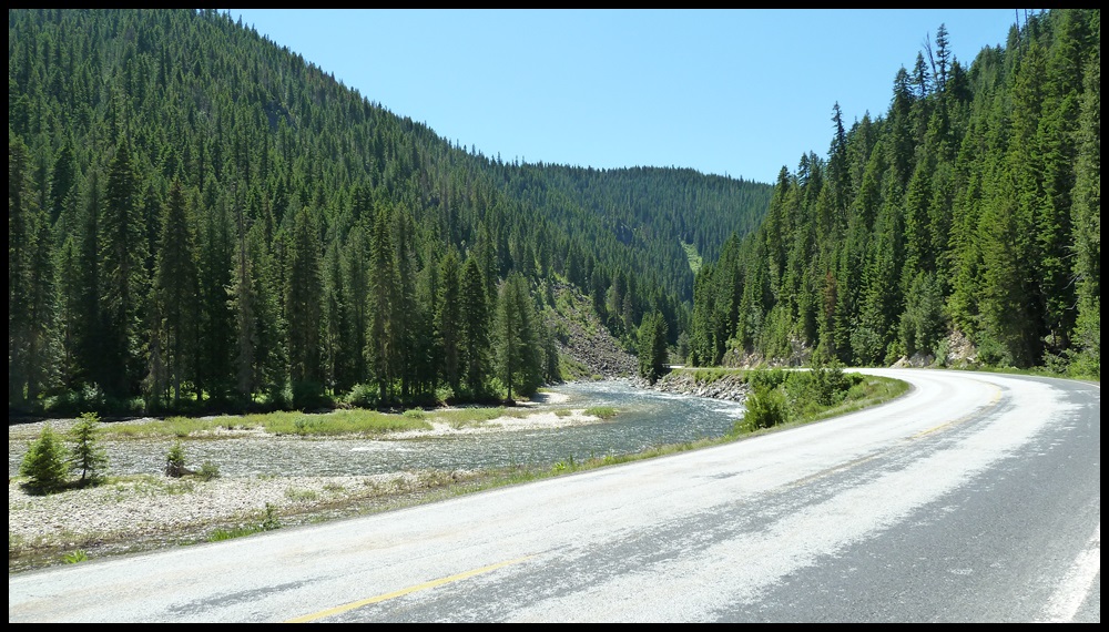 Comme on s’y attendait, on a la grosse patate le lendemain. On avale un col après le petit dej’ puis on enchaîne avec une route superbe le long de la Lochsa River.