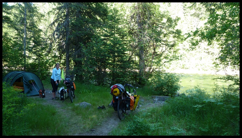Le soir, on se trouve THE camping à 8 dollars, calme, en bord de rivière, sauvage. On se lave une fois de plus en mode bushcraft. L’eau est toujours aussi froide mais Ophélie se paye le luxe de barboter un peu. Un peu plus tard, on apercevra même une loutre, ou un truc du genre, en tout cas c’était pas un canard ni un motoculteur.