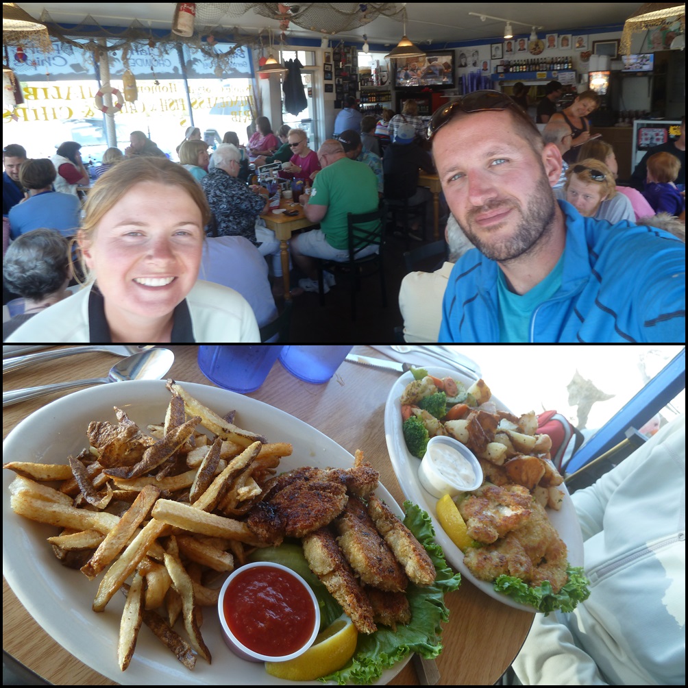 On a mangé dans un petit resto spécialisé dans les fruits de mer à l’américaine : tout est frit. Ophélie prend des clams (palourdes ??…) et moi des huîtres. Vu la taille des bestiaux, je suis content de pas les manger crus. C’est pas mauvais même si ça a plus le goût de panure que de fruit de mer.