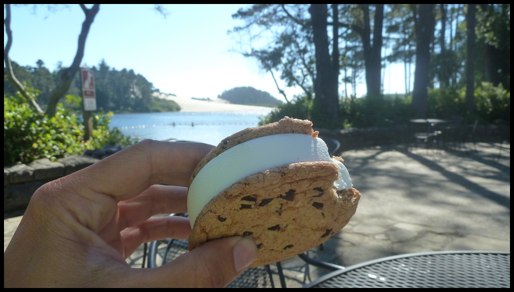 A Sunset Bay, James (futur docteur je précise) nous fait découvrir une autre spécialité ricaine : les S’mores, abréviation de « some more » qu’on traduirait pas « j’en veux encore ! ». La recette : 2 marshmallows grillés et du chocolat pris en sandwich entre 2 crackers, au miel pour les gourmands. Dès la 1ere bouchée, on comprend pourquoi la moitié de ce pays est diabétique. Mais après une bonne journée de vélo, ça passe tout seul.