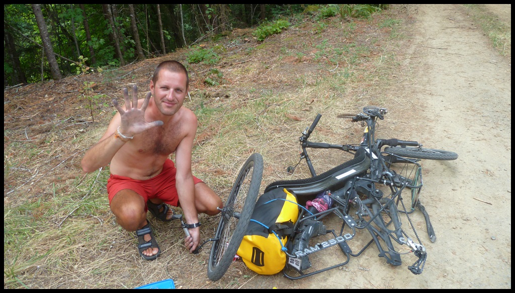 Quand on arrive au lac, y’a pas de resto, d’épicerie, de camping, rien ! On est obligé de se farcir 16 km de plus pour boire un coup et encore 12 de plus pour le camping. Heureusement, un couple d’Orléanais vient discuter avec nous et nous donne de l’eau. Je pense que la faim devait se lire sur mon visage, le gars me tend une pâtisserie et comme je l’avale en 2 bouchées, il m’en tend une 2eme. Il aurait pu y perdre sa main, c’était comme donner un bout de viande à un pitbull.