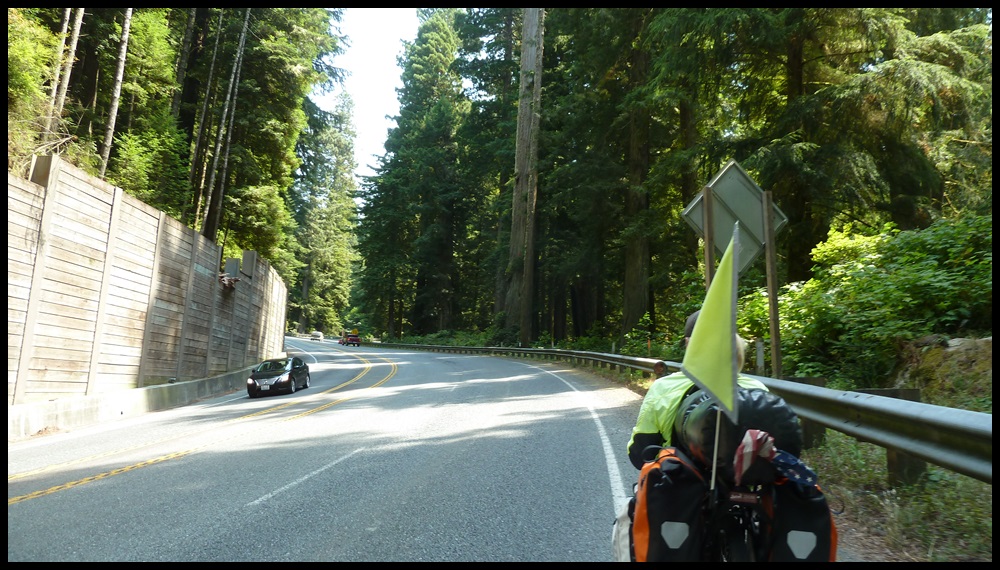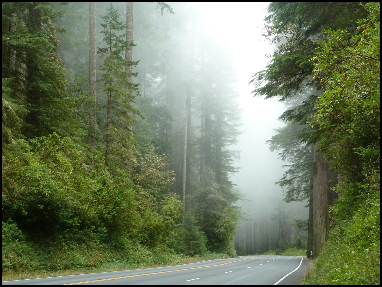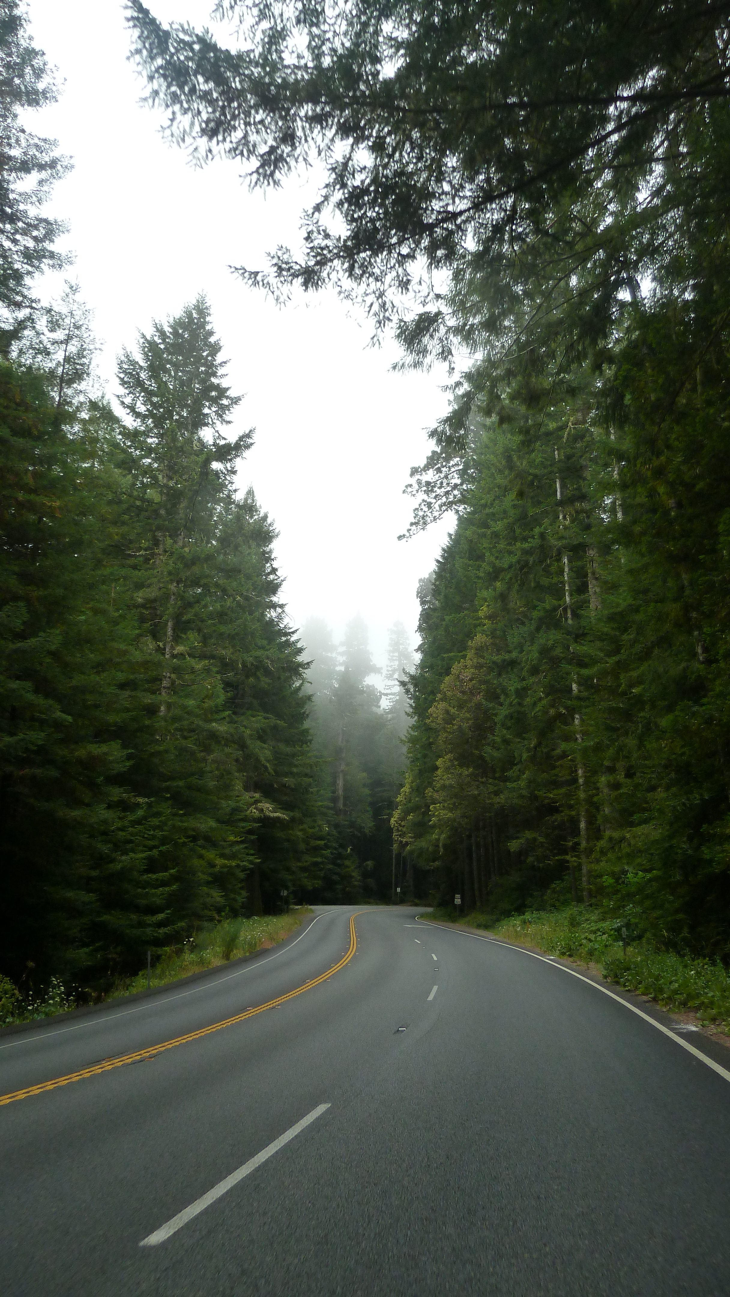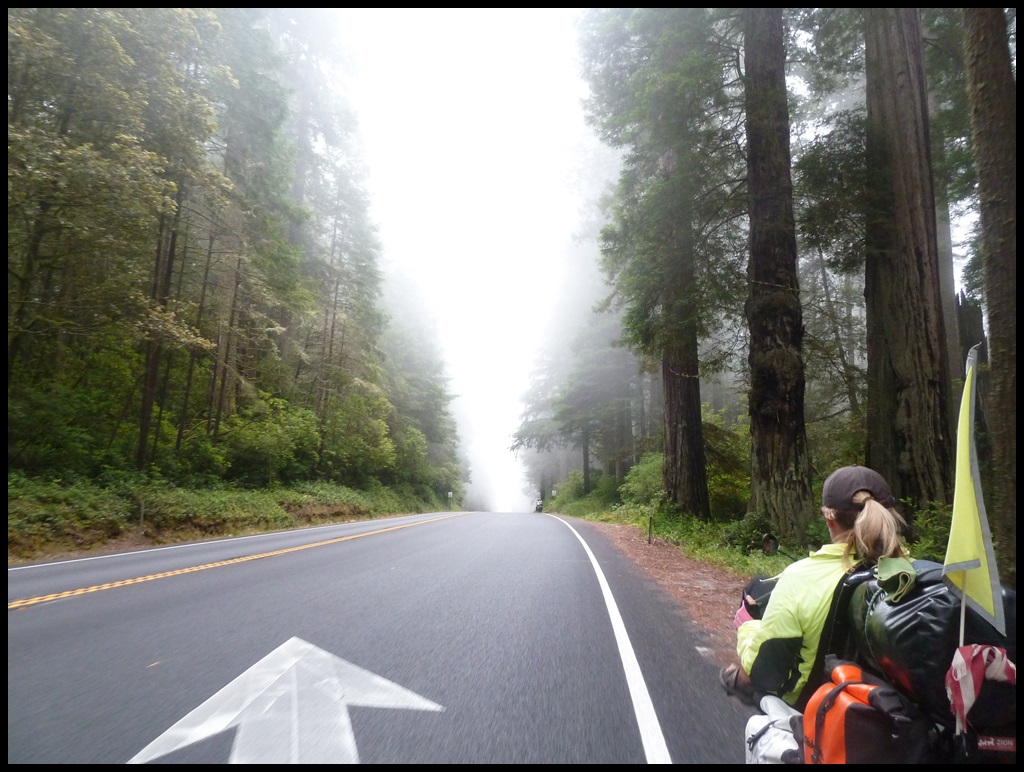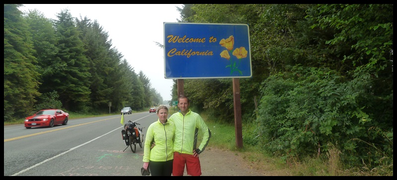 Au bout de quelques kilomètres, nous entrons en Californie. Rien que le nom fait rêver, on imagine les plages ensoleillées, les oranges, les bombasses en bikini, les surfeurs… mais pour l’instant, ce n’est que brouillard et eau glaciale.