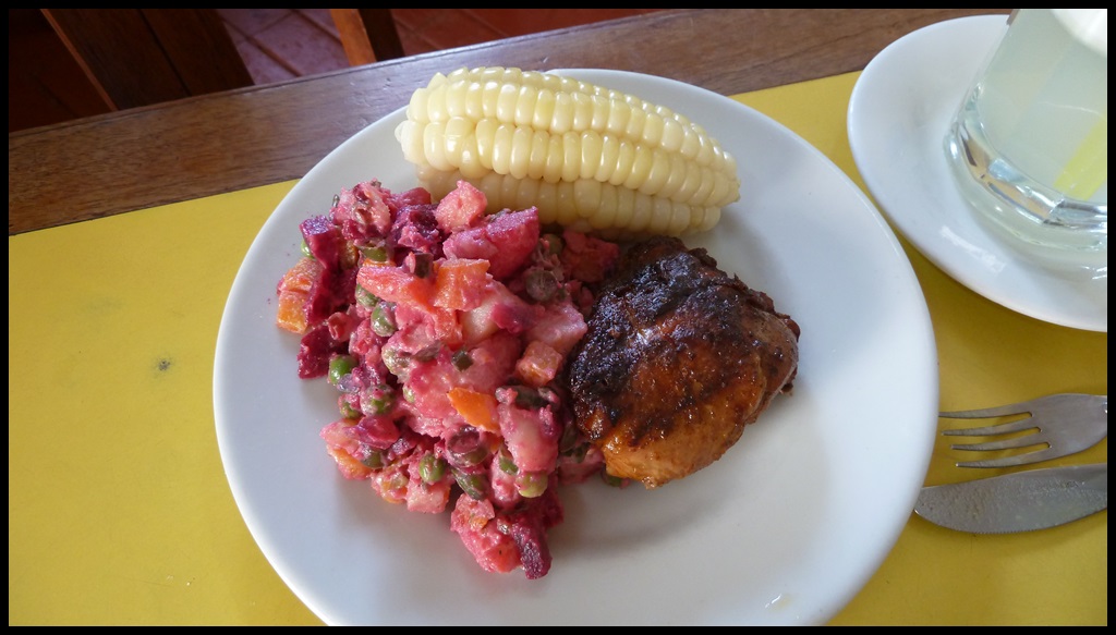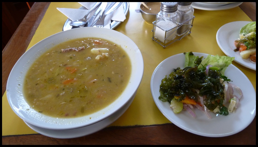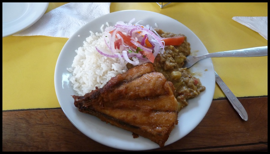 On se trouve un p’tit resto plein de Péruviens, on n’a même pas peur. Il n’y a plus de place mais on partage une table avec 2 autres personnes, c’est la façon de faire ici apparemment. On prend le menu familial et on mange très bien pour moins de 3 € chacun. On va se plaire ici.