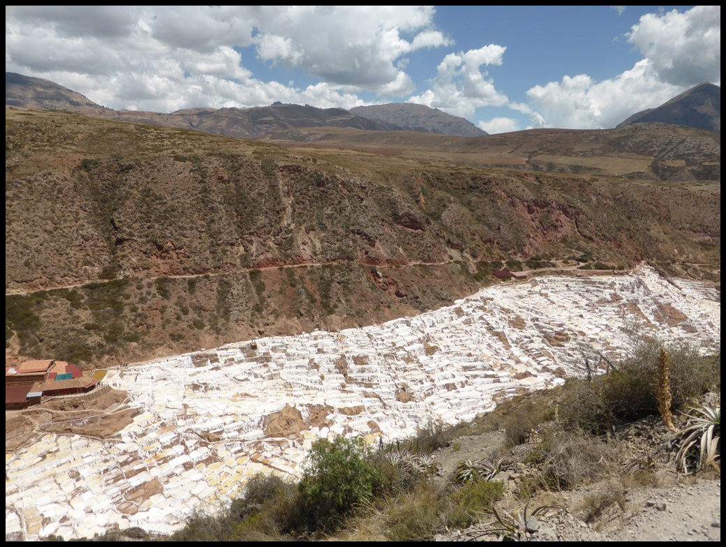 Les Salinas : endroit incroyable avec ses très nombreuses piscines de sel. Le guide dit qu’il y en a 5000… il doit confondre avec 500. L’eau salée vient d’une petite source des montagnes en amont mais son origine reste un mystère. Il pourrait s’agir d’une petite mer souterraine mais l’eau de mer n’est chargée que de 30g de sel par litre alors qu’ici il y en a 53. On l’a gouté, ça pique vraiment.