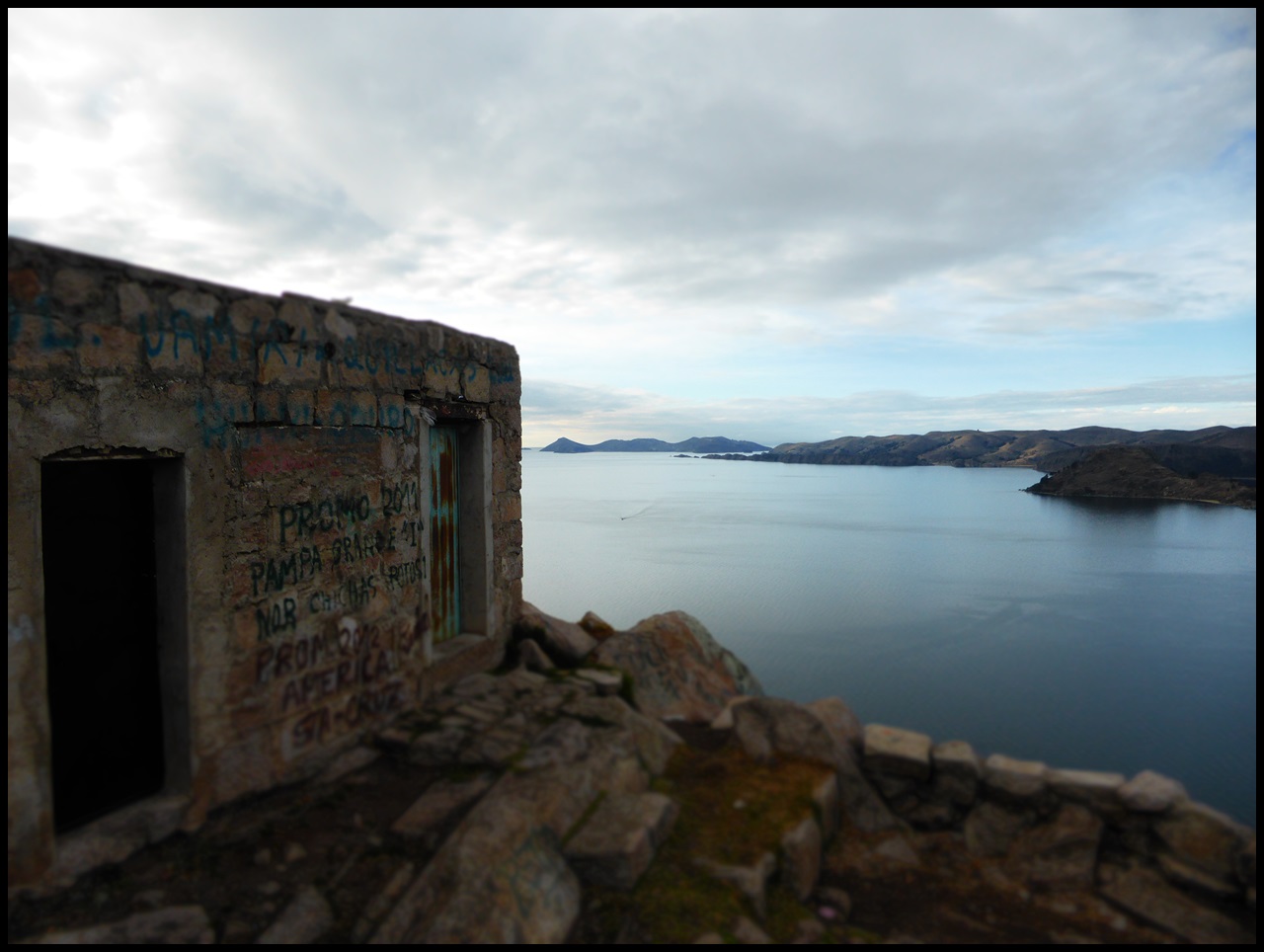 Après une dernière côte qui finit de remplir nos jambes d’acide lactique (il est 15h30 et on a rien avaler depuis 8h), on arrive à Copacabana. 1Er hotel = 200 Bolivianos la nuit (22 €) ; ceux-là, ils ont senti le pigeon bien crevé qui voulait se poser fissa. Mais le pigeon est crevard. 4eme hôtel = 75 Bol avec le petit dej’ et une vue sympa sur le lac.