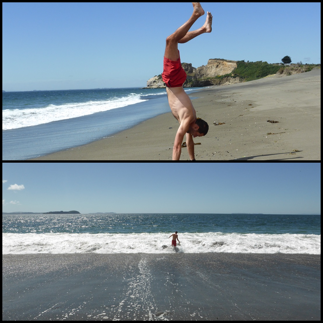 On se pose au camping à 15h et filons à la plage. Ça y est, là, c’est le Pacifique, le vrai, celui que nous avions quitté à San Francisco 4 mois plus tôt. Pour fêter ça, je me baque. La vache, ça caille autant qu’aux US !! 15-16°C, pas plus, parfait pour les rotules. Tiens prends ça sale tendinite, tu fais moins ta maligne hein ?!!
