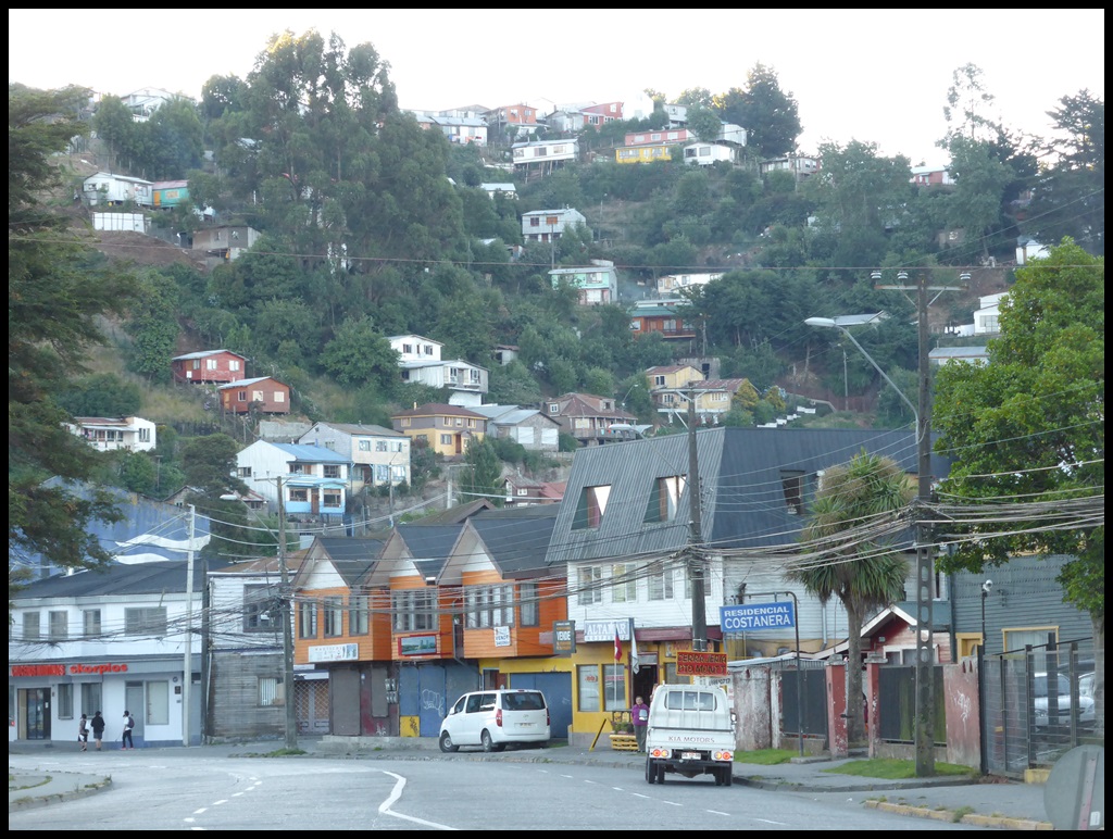 Castro est une petite ville agréable, pas particulièrement belle ni moche mais avec des bâtisses étonnantes, dont l’église jaune et violette. On dirait presque une boîte gay. Moi ça me plaît ce côté décalé, moins austère et sérieux, plus chaleureux.