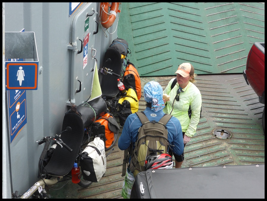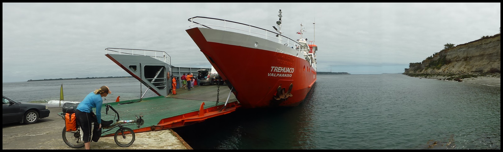 Le 08/01, c’est pas la fête mais ça devrait aller pour rouler sans envoyer du pâté. Une fois sortie de Puerto Resto (sympa la route à 10 % pleine de bus), on enchaîne sur la panaméricaine. Autoroute en travaux, rien à voir mais c’est plat et on trace bien jusqu’à l’embarcadère pour l’Île Chiloé. Là, c’est limite si on ne s’arrête même pas avant de monter dans le bateau.