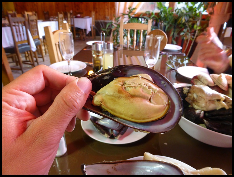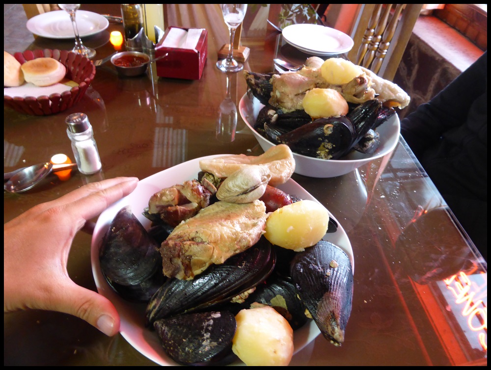 Accrochez-vous : dans la même assiette, ou plutôt un saladier, il y a : une saucisse, un beau morceau de poulet, des patates, du pain de pomme de terre, quelques palourdes et des moules monstrueuses de plus de 10 cm. Là, je ne peux que citer une philosophe Ardennaise encore trop peu connue : « les Chiliennes, même grosses elles sont bonnes ».