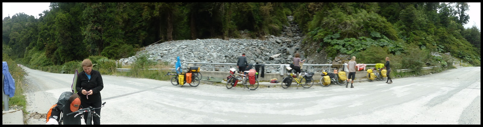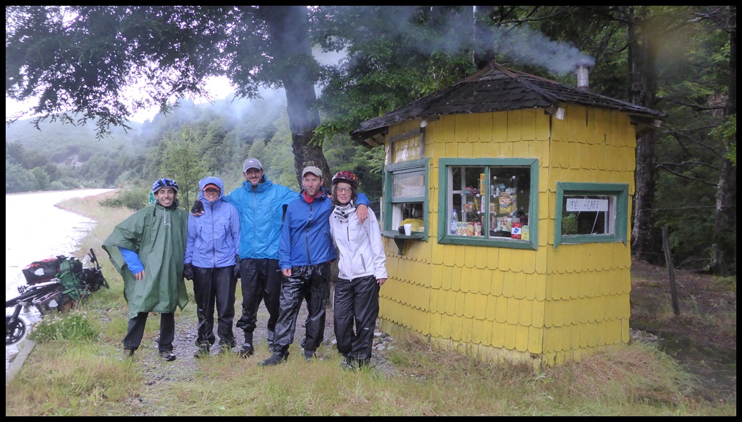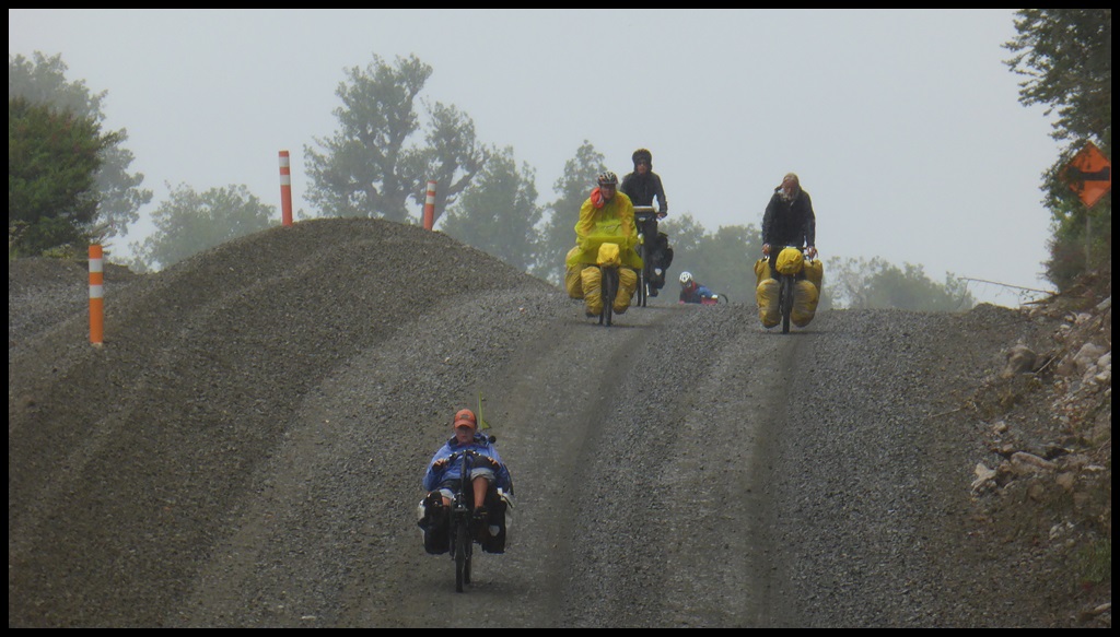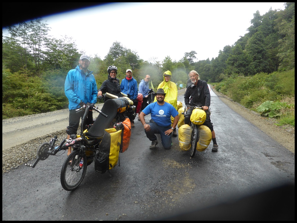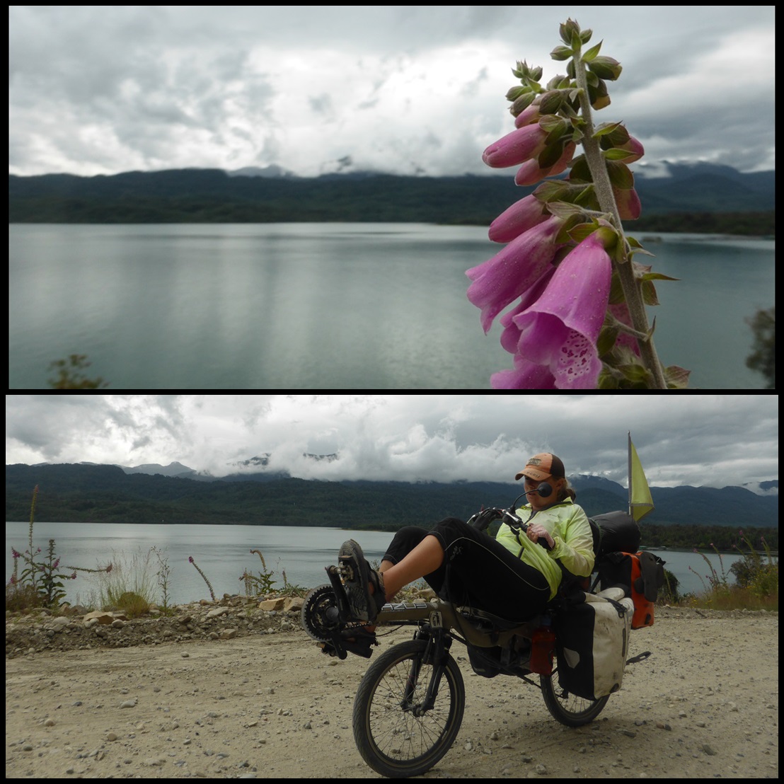 Il n’y a plus de travaux dorénavant et la piste est ce qu’elle aurait du être depuis le début : bien roulante et sans galets. Ça monte, ça descend et ça crachine dans un paysage remarquable que même les nuages arrivent à mettre en valeur. Ça fait du bien de rouler en groupe, on en avait besoin à ce moment du voyage. Et je crois que c’est la même chose pour nos compagnons.