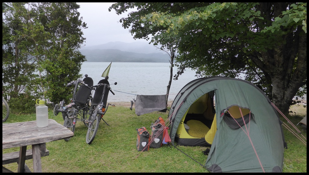 Le soir, on se trouve un camping (enfin LE camping puisque c’est le seul de la journée) en bord d’un lac. Pas un lac en fait, l’océan pacifique après vérification sur la carte.