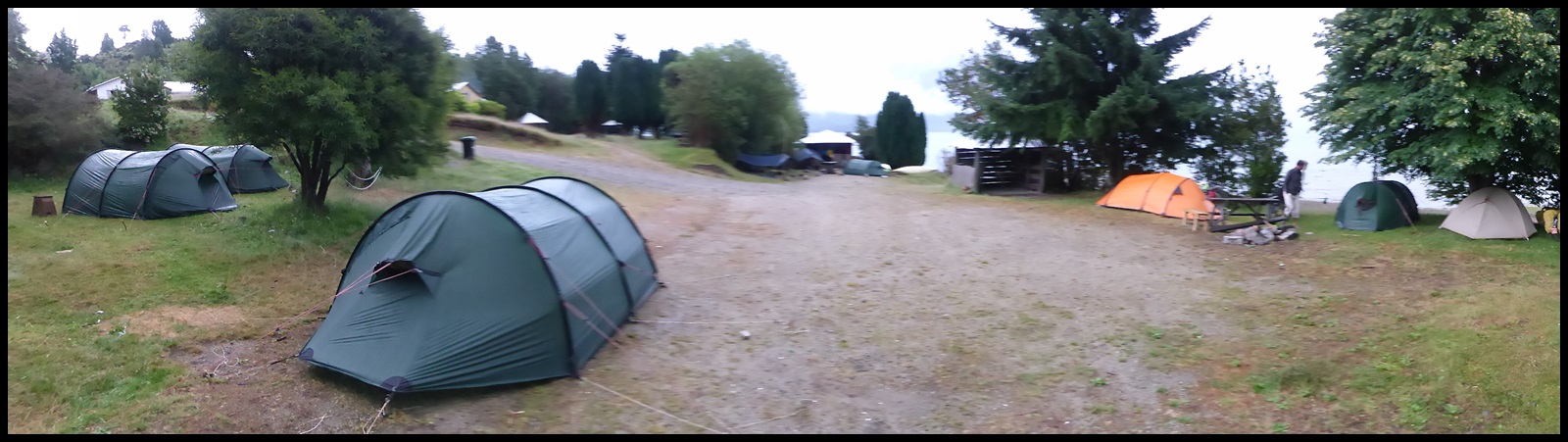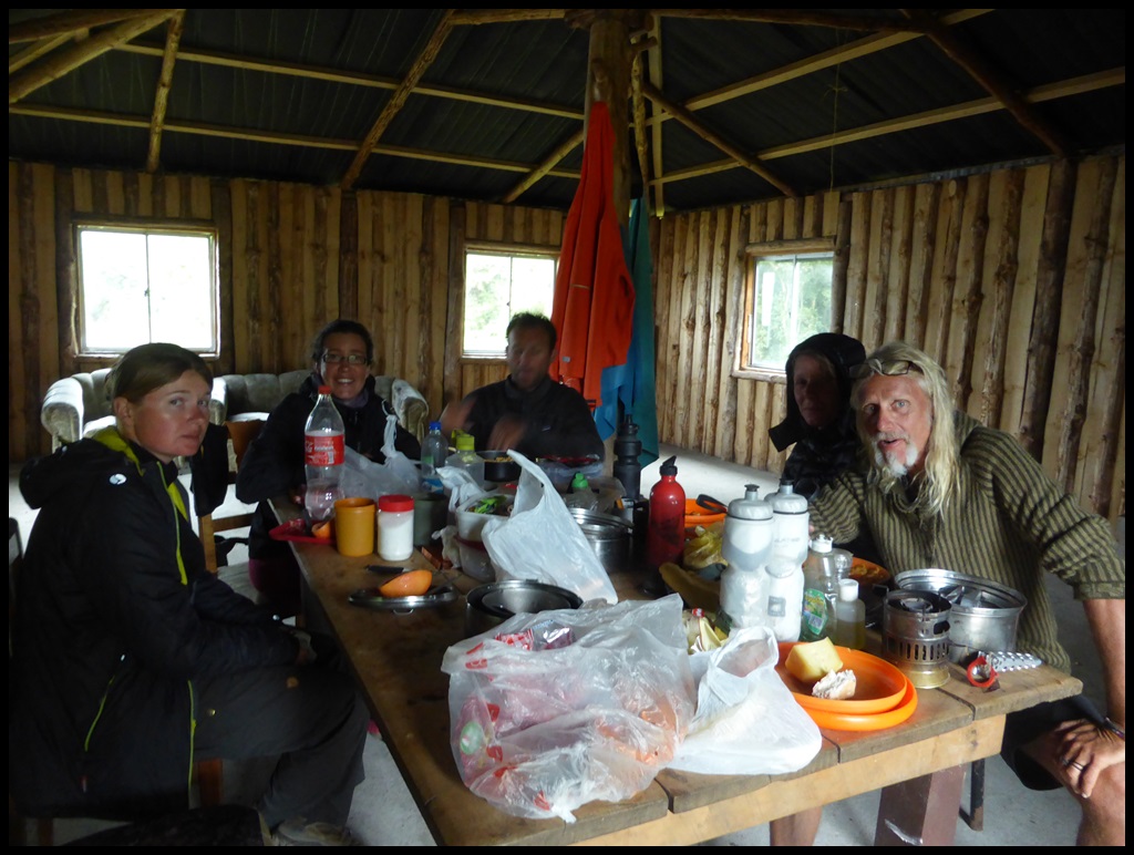 On se lève tard à cause de la tempête. La tente de Flo et Tom prend l’eau par le sol, pas glop. La notre est totalement sèche gràce la soufflerie venant du flord. 5 Hillebergs sur le même spot, qui dit mieux ? Les autres appartiennent à une bande d’étudiants US, fils de riche en voyage aventure tout organisé pendant 6 mois en Amérique du Sud : 1 mois d’escalade, 1 mois de kayak, 1 mois de trek… tout ça dans le cadre de leurs études. De futurs dirigeants, conscients des réalités et proche du peuple.