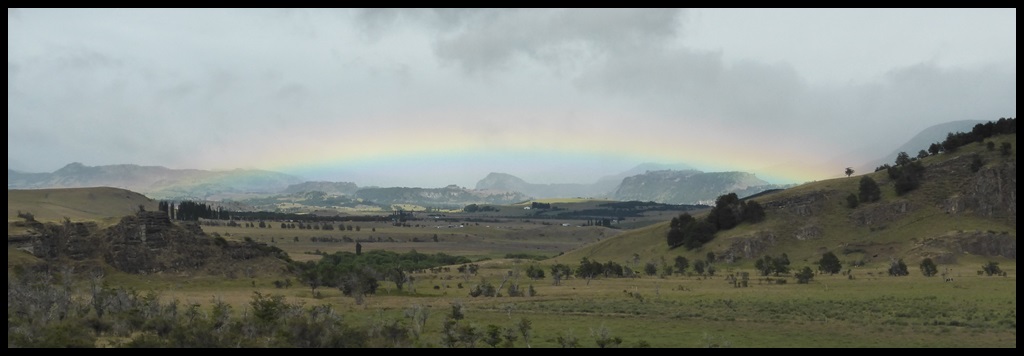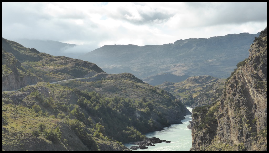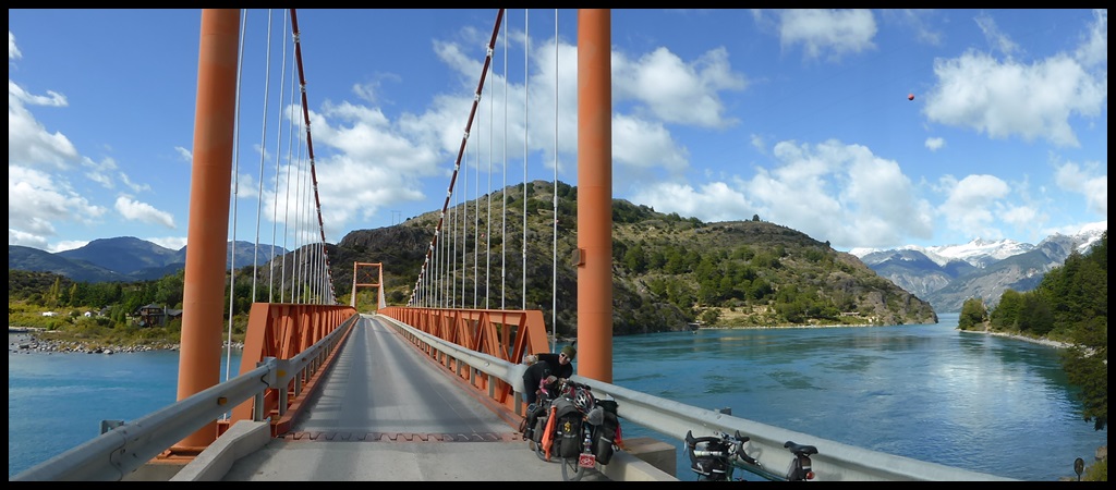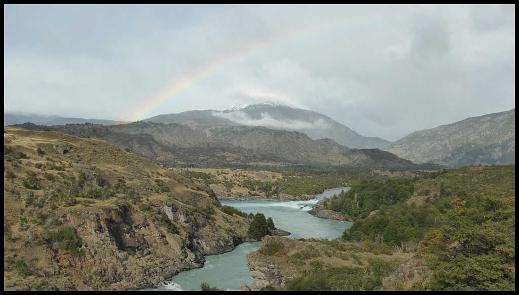 Au matin, on repart sous la pluie mais elle s’arrête aussitôt, dévoilant le soleil et un bel arc-en-ciel au dessus du Rio Baker au débit impressionnant. La piste est meilleure et le 10 % n’est plus qu’une formalité en l’absence de tôle ondulée.