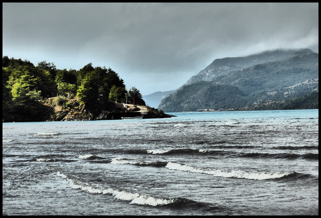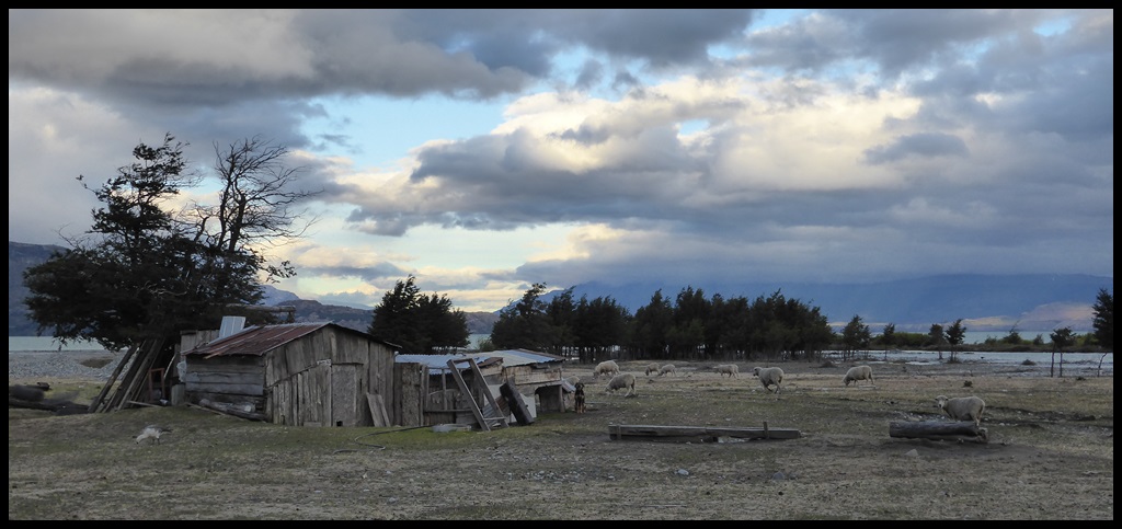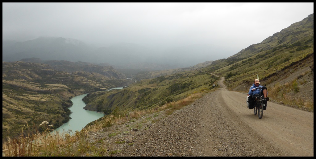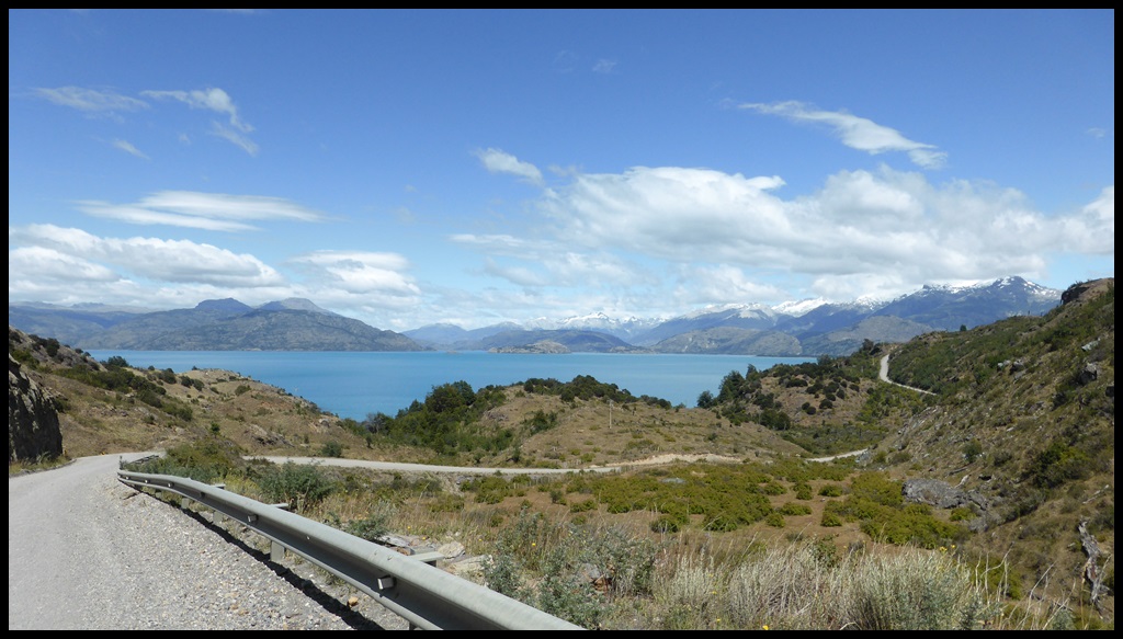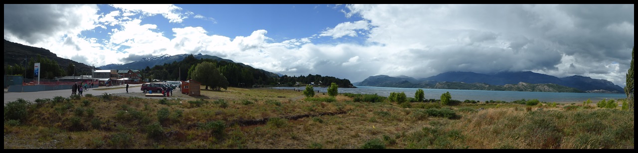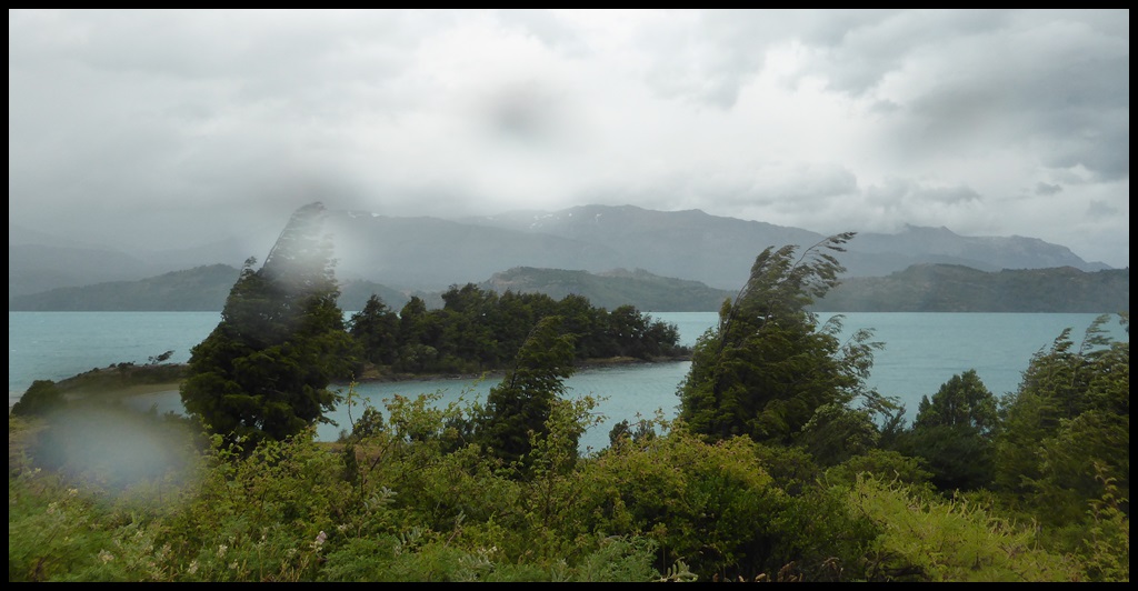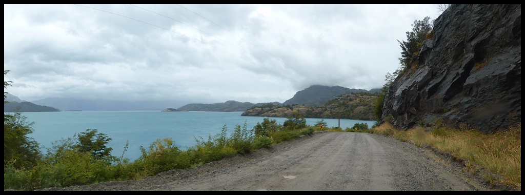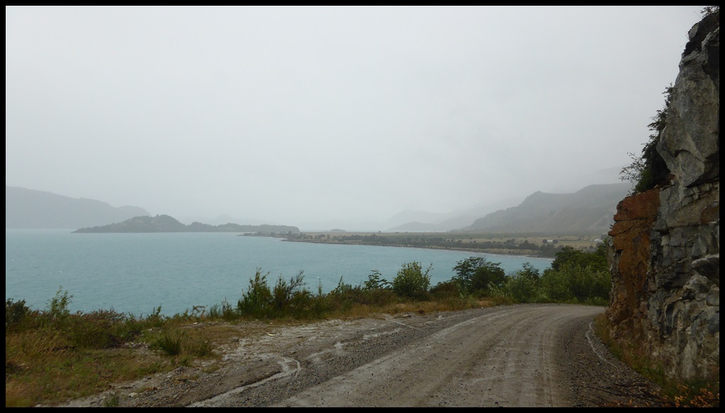 La pluie ne cesse jamais et on arrive complètement mouillé à Puerto Rio Tranquillo, au bord du plus grand lac Chilien, qui est en fait à cheval entre le Chili et l’Argentine. A cause de la pluie, on a roulé non stop sans presque rien manger, à part des côtes terribles, dont une à 17 % avec de la tôle ondulée comme des marches d’escalier.