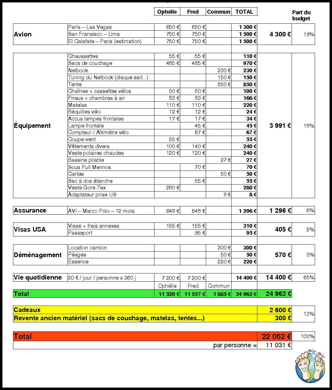 Avec 20 € par jour et par personne, on a prévu large. Ça risque d’être moins, voir beaucoup moins en Amérique du Sud.