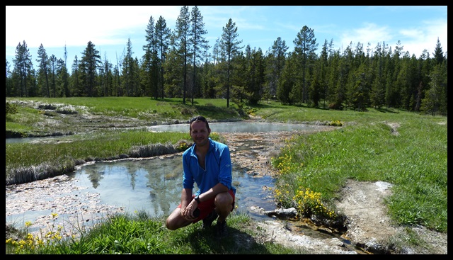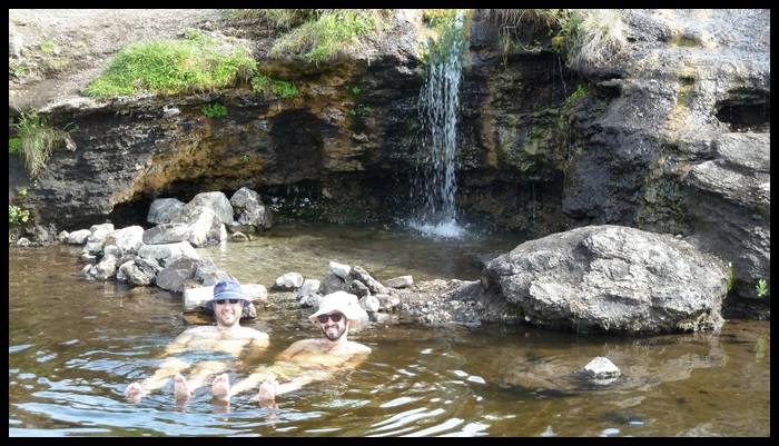 Sur les tuyaux de Tad, un cyclo rencontré le matin, on part à la recherche d’une source d’eau chaude se trouvant à 15 minutes à pieds… On marche pendant 1 heure et on finit par tomber sur Tad qui cherche aussi. Re-marche jusqu’à ce qu’on tombe sur un joggeur qui nous indique le chemin. Oui, car y’a aucun panneau et c’est pas sur les cartes, c’est un truc un peu secret pour les gens qui le méritent. A moins que ça soit un spot pour les gay, qui sait.