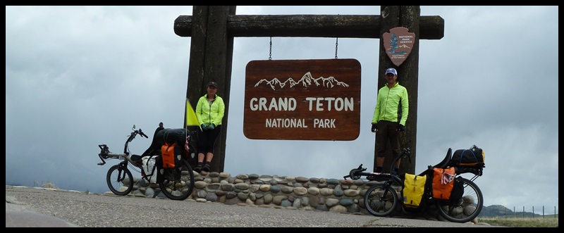 On part vers 9h30 de la maison d’Aude & Alan après un petit déj copieux. Nous prenons une piste cyclable qui nous amène tranquillement à l’entrée du parc de Grand Téton et nous roulons facilement avec un léger crachin + grêlon jusqu’au camping. Petite matinée facile mais dès notre arrivée au camping, le temps se gâte et il se met à pleuvoir. La température chute rapidement, passant de 12 à 3 °C.