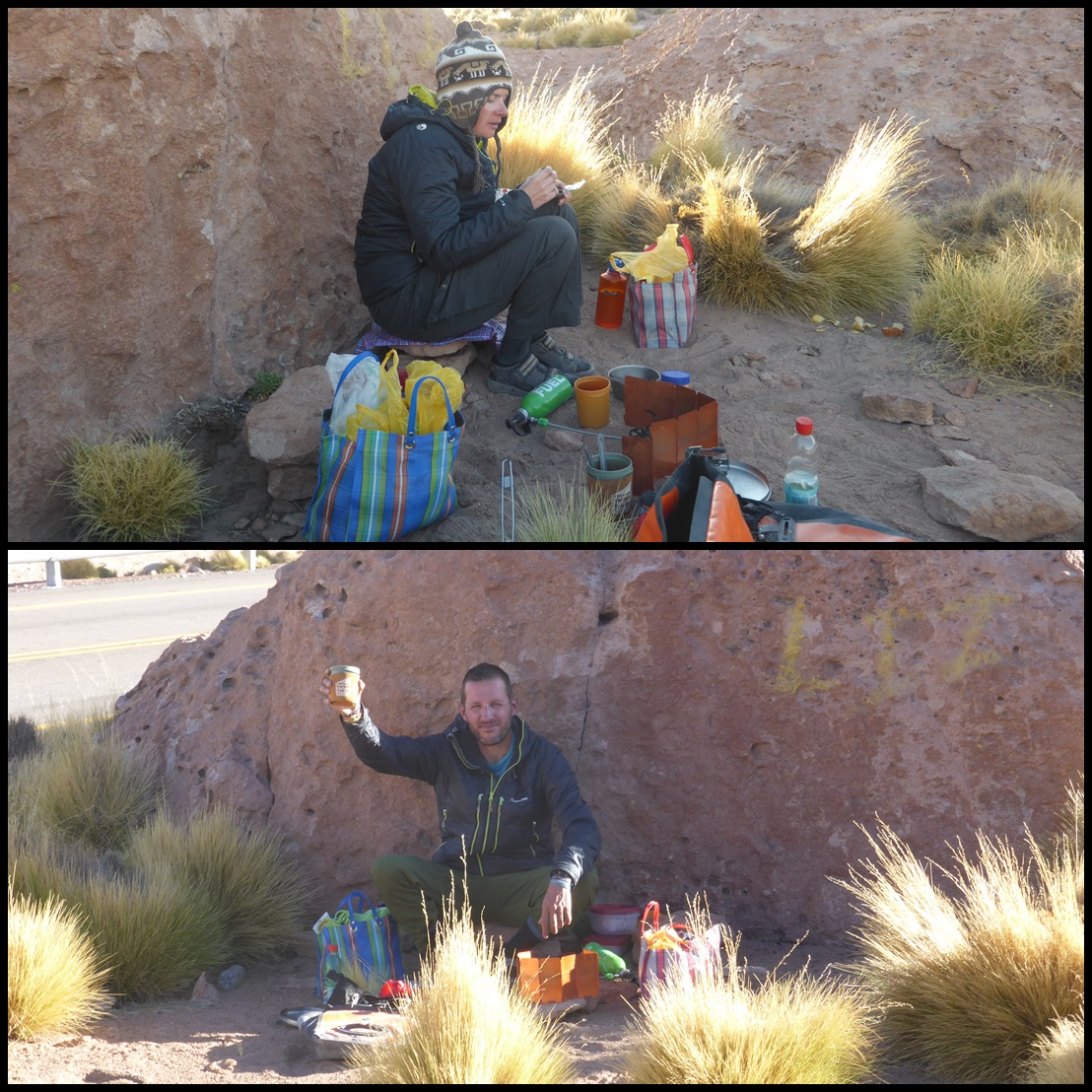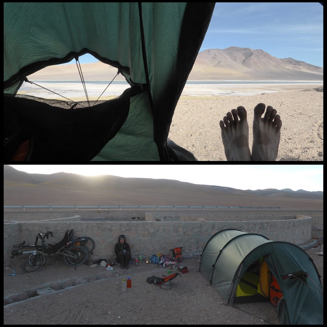 A 4100m, après 1700 de D+, on est cuit et on décide de planter la tente en bord de route. On visait 2000 m de D+ mais les 8% de pente nous découragent, ça fait déjà quelques kilomètres qu’on est dans un effort anaérobique et l’acide lactique commence à couler à flot dans nos jambes de poulet. On s’endort comme après un bon fix à la morphine.