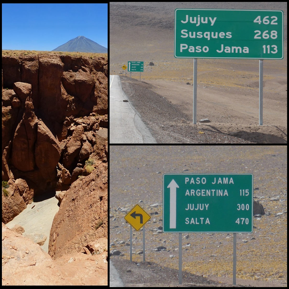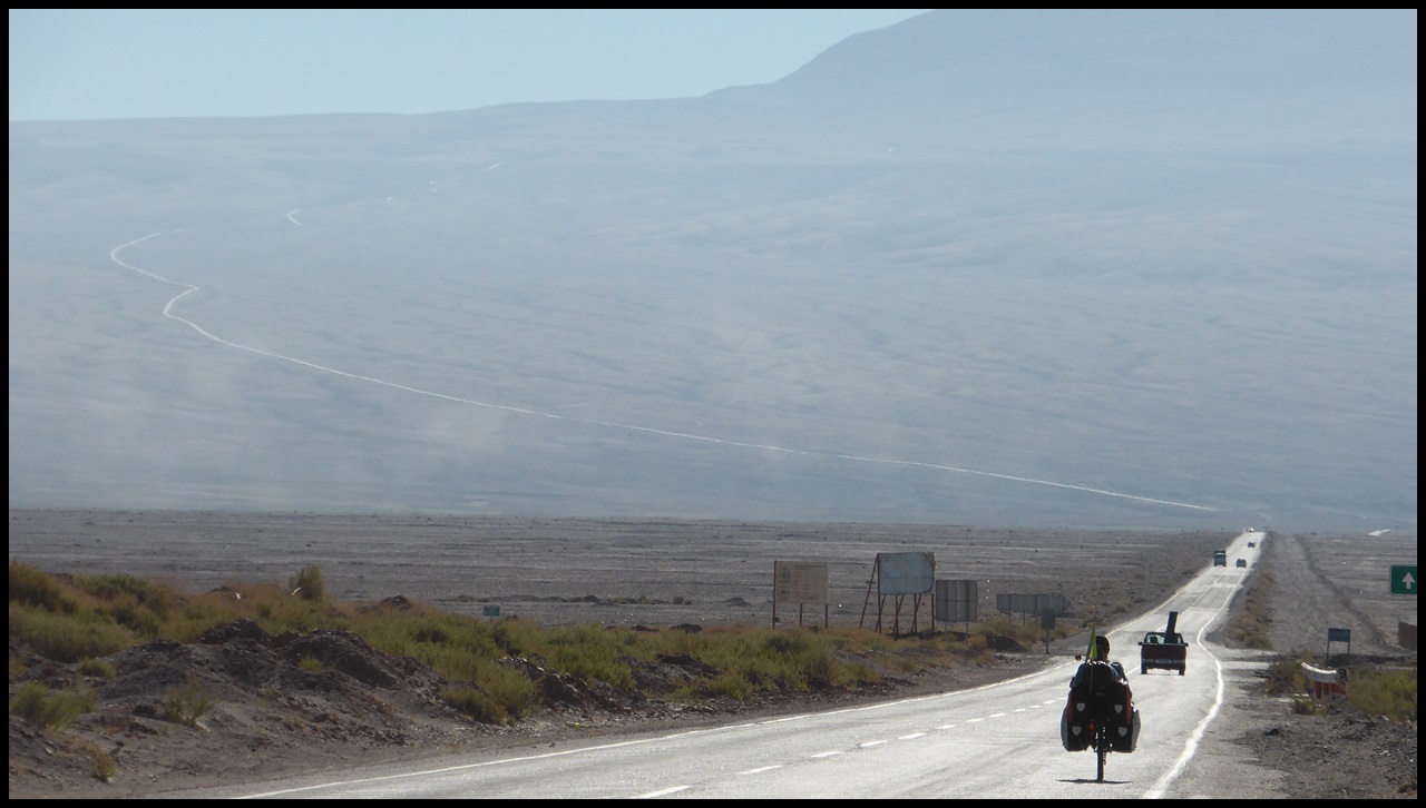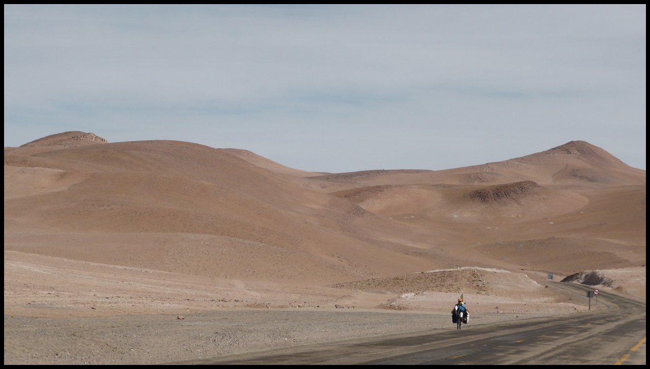 L’étape du jour est facile jusqu’à Jama, point de passage en Argentine. Les pentes ne dépassent plus les 3 ou 4%, quel bonheur, on s’envole ! En prime, pas de vent ce matin. Côté paysage, c’est toujours grandiose et changeant : dunes géantes pétrifiées, lagune à flamand roses (pas la même espèce qu’avant, ils ont un bec noir maintenant), montagnes dodus, timides canyons, rochers esseulés… pas de Mc Do malheureusement, on boirait bien un coca là.
