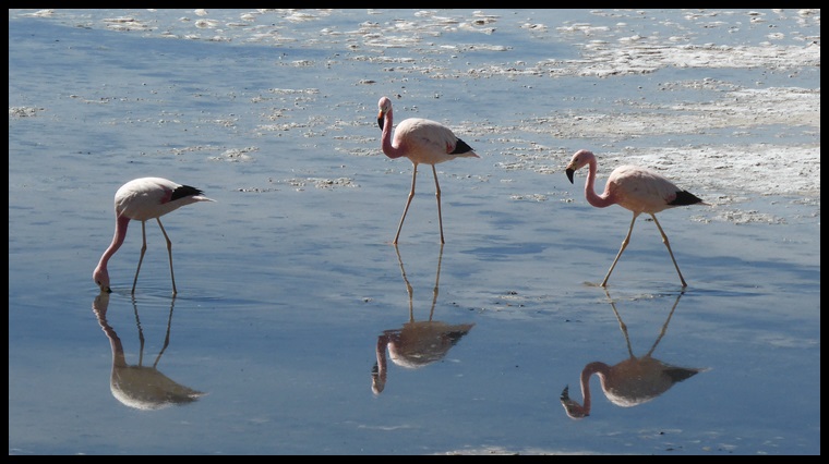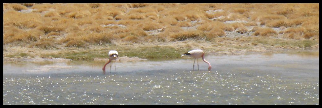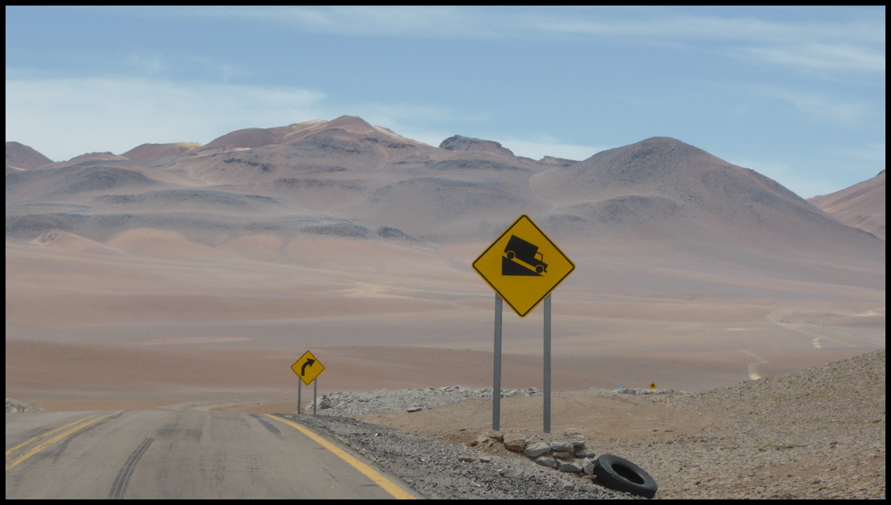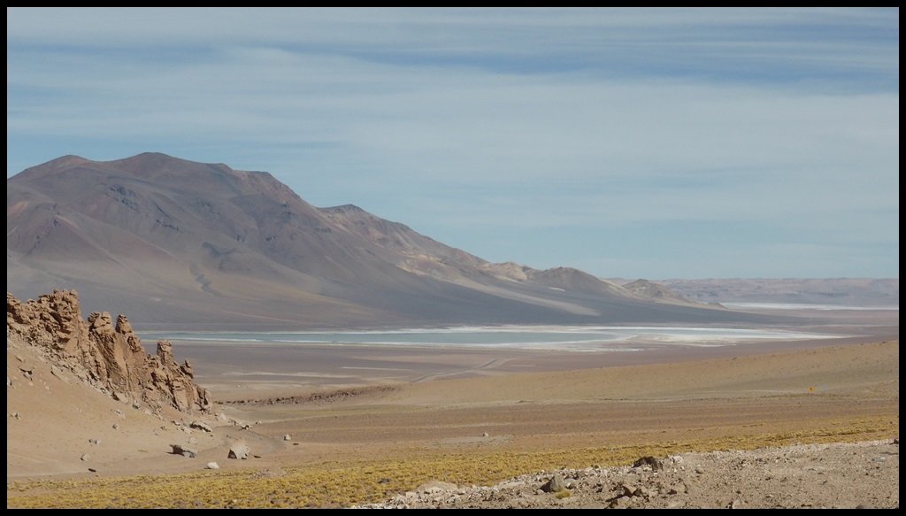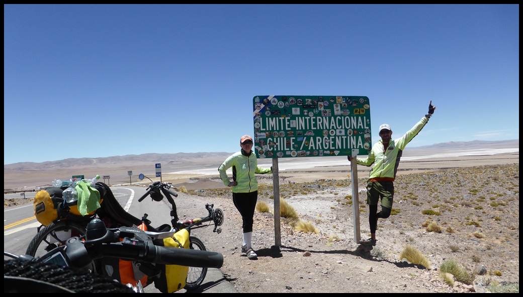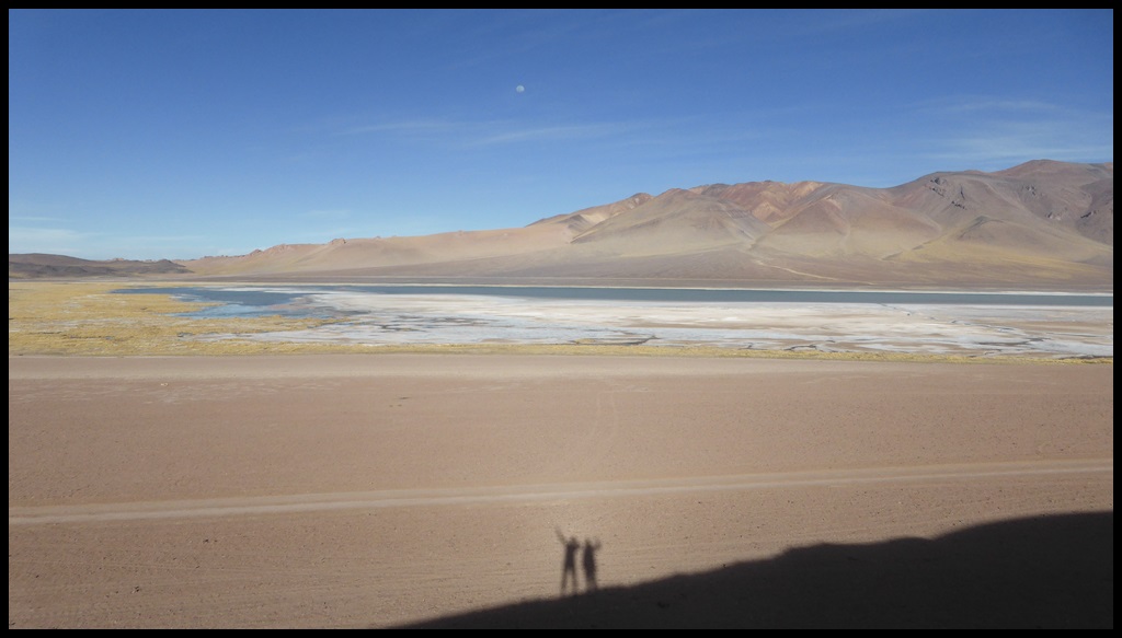 L’étape du jour est facile jusqu’à Jama, point de passage en Argentine. Les pentes ne dépassent plus les 3 ou 4%, quel bonheur, on s’envole ! En prime, pas de vent ce matin. Côté paysage, c’est toujours grandiose et changeant : dunes géantes pétrifiées, lagune à flamand roses (pas la même espèce qu’avant, ils ont un bec noir maintenant), montagnes dodus, timides canyons, rochers esseulés… pas de Mc Do malheureusement, on boirait bien un coca là.