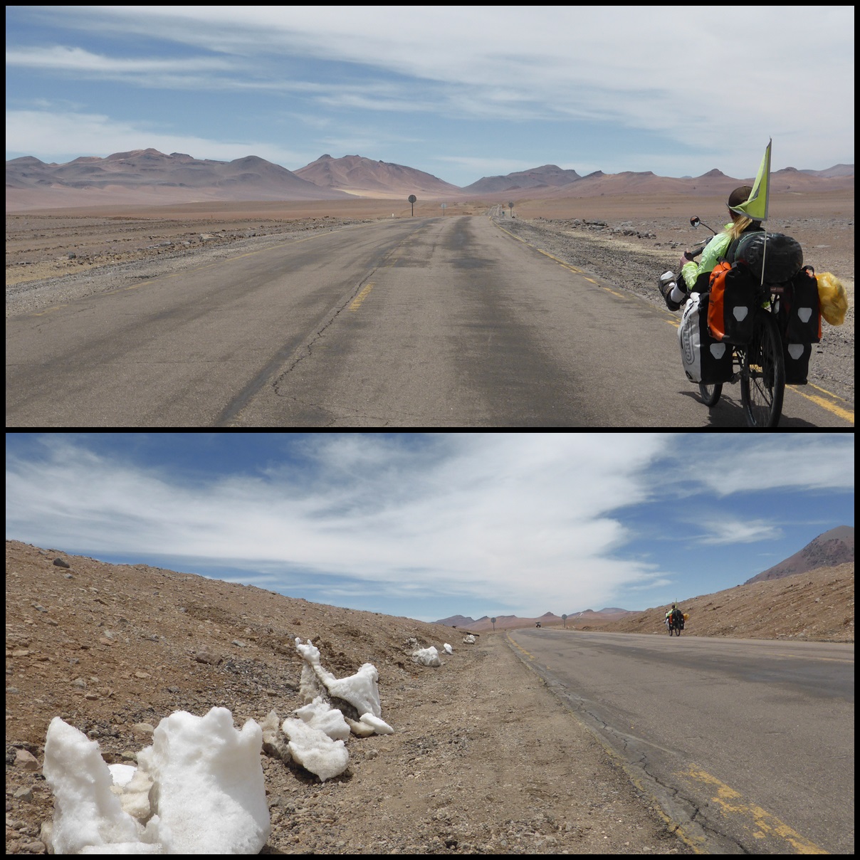 Maintenant, qui oserez dire qu’un vélo couché n’est pas bon en côte ? C’est une réflexion qu’on entend souvent d’autres cyclistes n’en ayant jamais fait, ou pas assez visiblement. Avec Ophélie, nous ne sommes pas des monstres du vélo et encore moins des grimpeurs (quoique un peu maintenant par la force des choses), et pourtant, nous avons emmené nos vélos très haut, sans se griller complètement. Le mien faisait environ 60 kg en partant de San Pedro et ma vitesse moyenne a été de 6,8 km/h jusqu’au sommet. Aurais-je été plus vite en vélo droit ? Je ne crois pas.