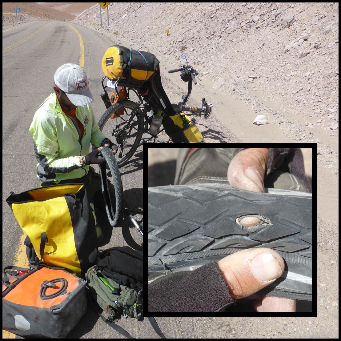 On attaque la côte et BOOUUMM PFFFUUIIITTTTT, mon pneu avant explose. Vous vous souvenez de la fissure de l’autre jour ? J’y passe mon doigt maintenant, donc un filou de caillou a du facilement s’y faufiler pour percer la chambre à air.