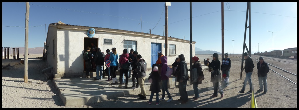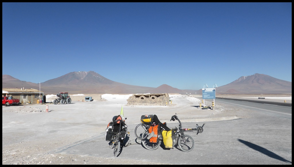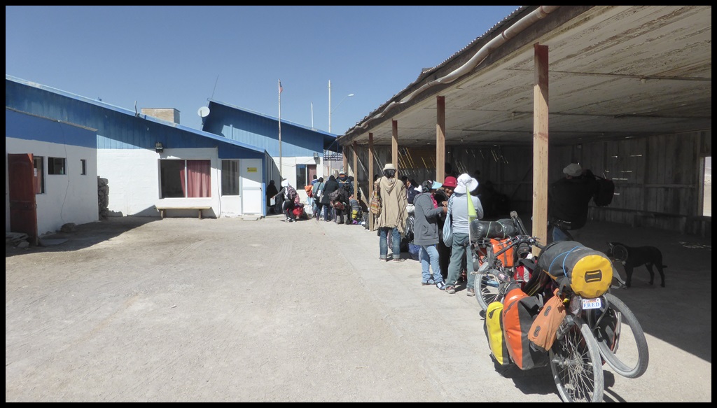 Ensuite, c’est une nouvelle queue pour la fouille des bagages. Là, on a du bol : alors qu’Ophélie se fait fouiller toutes les sacoches (qui ne contiennent que les nouilles chinoises et une douzaine de pièges à écureuil), pour moi, le mec se contente de regarder vite-fait dans une seule et zappe celle qui contient les produits soi-disant interdits. En fait, ils veulent surtout pas voir des fruits et légumes frais. En venant d’Uyuni à vélo, il y avait très peu de chance qu’il nous en reste.