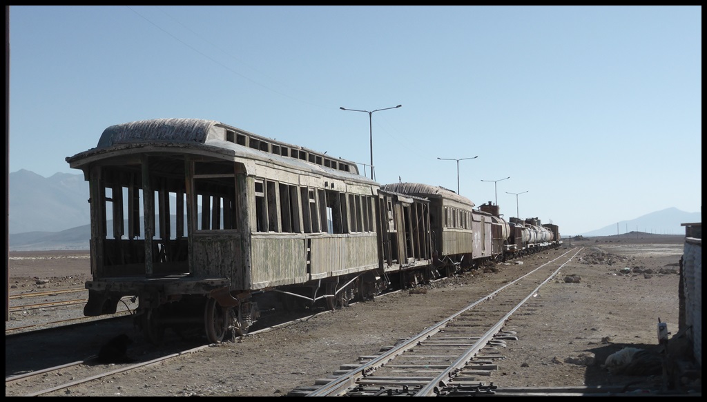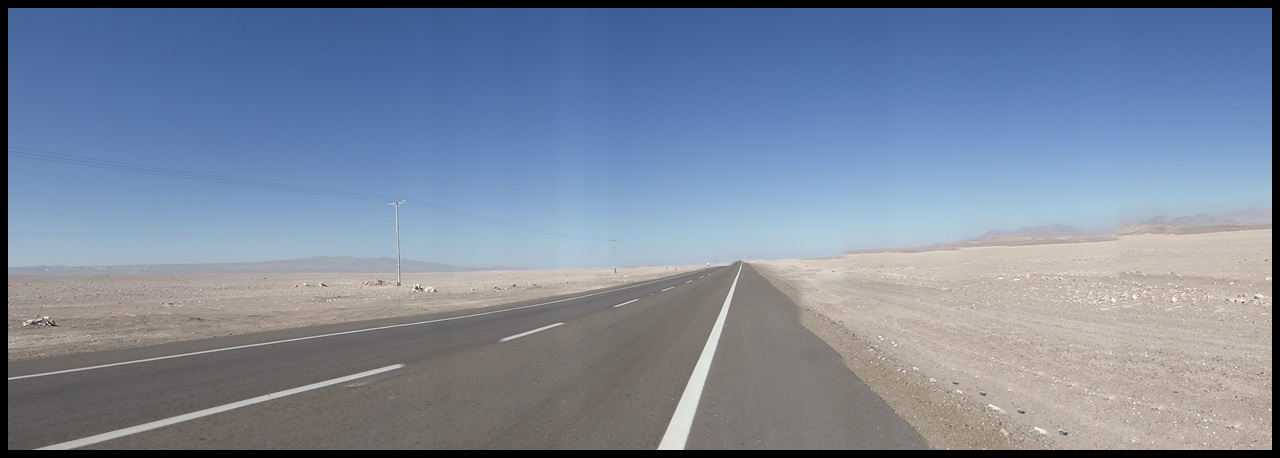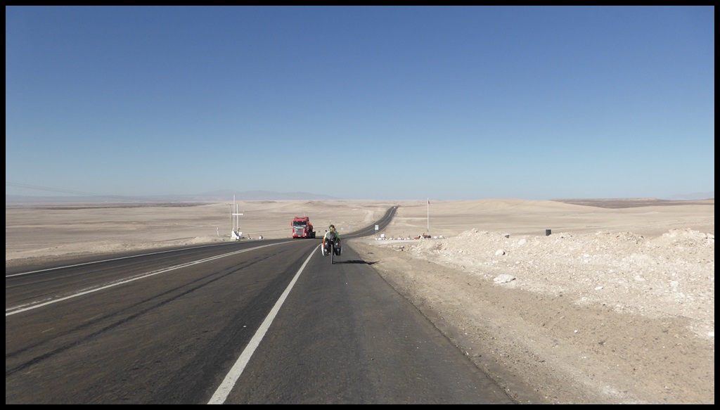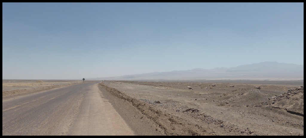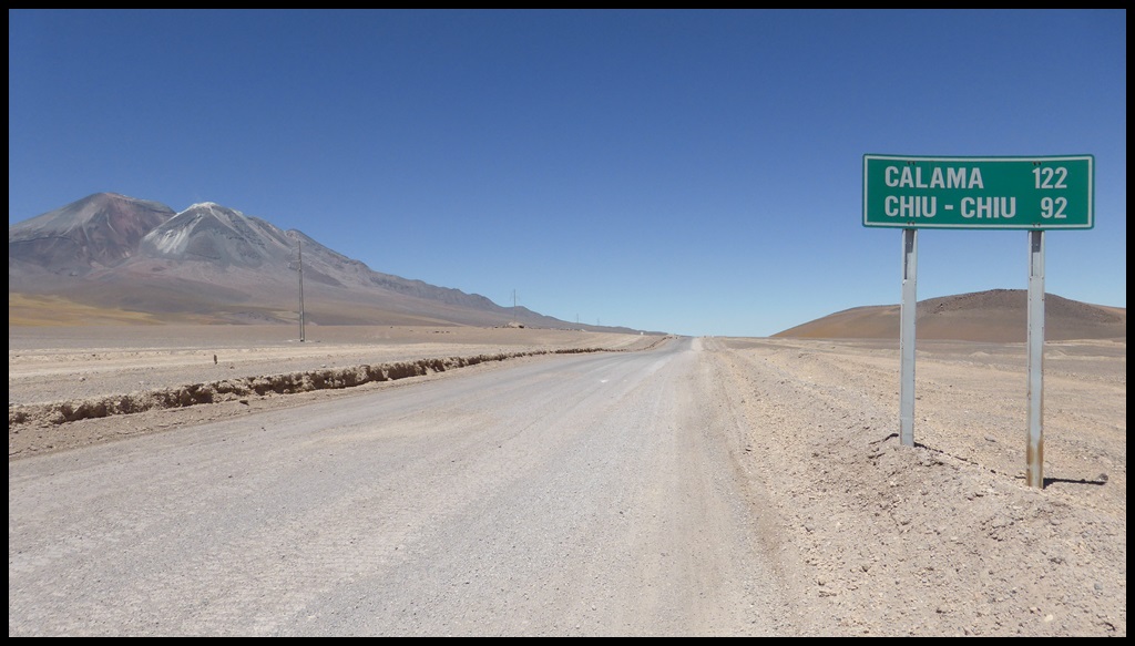 Le lendemain, on se réconcilie avec nos vélos avec 35 km vent dans le dos avalés à 27 km/h de moyenne. A 8h30, on est déjà dans une chambre d’hôtel à Calama en train de vérifier combien on vient de payer… on ne connaissait même pas la conversion euros/chilenos… Ce dernier ne vaut rien : 1000 pesos = 1,37 €. On se retrouve à payer 40000 pesos au supermarché.