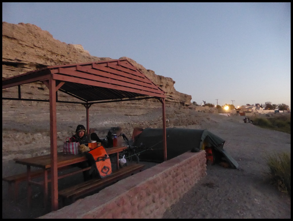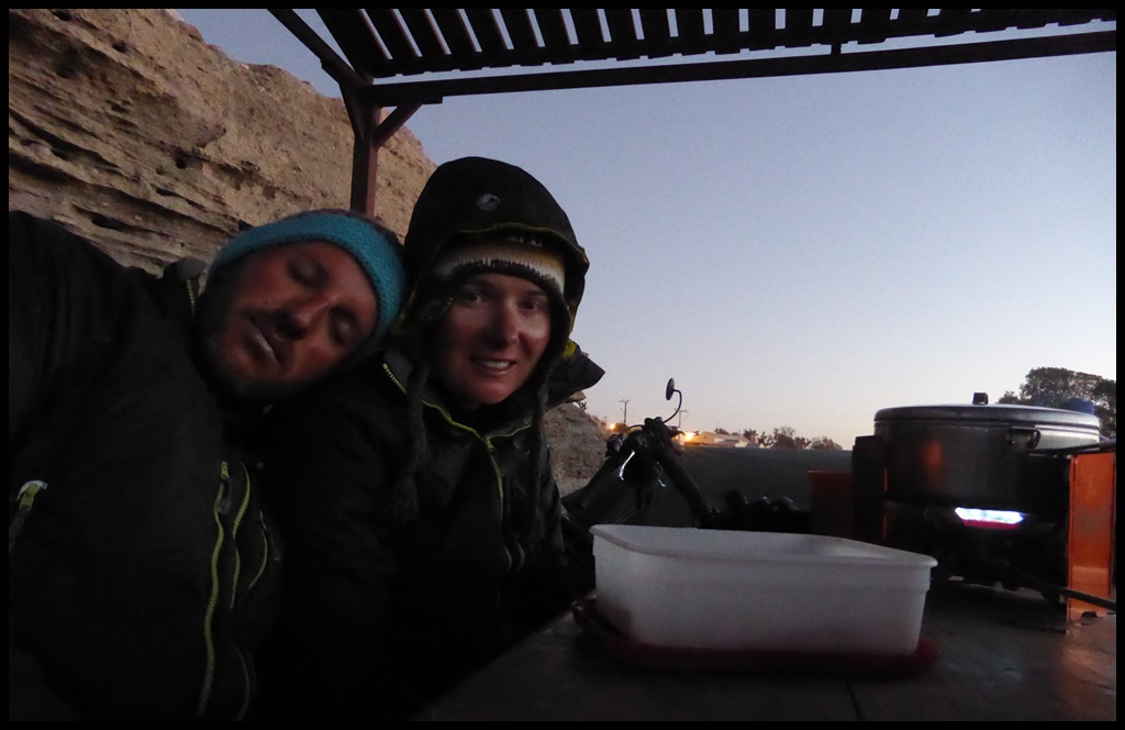 Il souffle comme la veille et ça durera jusqu’au coucher du soleil. Heureusement, ça descend car on passe de 3970 à 2719 en 90 km. Encore une fois, on déjeune derrière nos vélos et on pédale en descente. Journée très difficile, élue la pire du voyage, un truc à te dégoûter du vélo. Rien n’arrête ce vent et il n’y a aucun abris dans ce désert de caillasse.