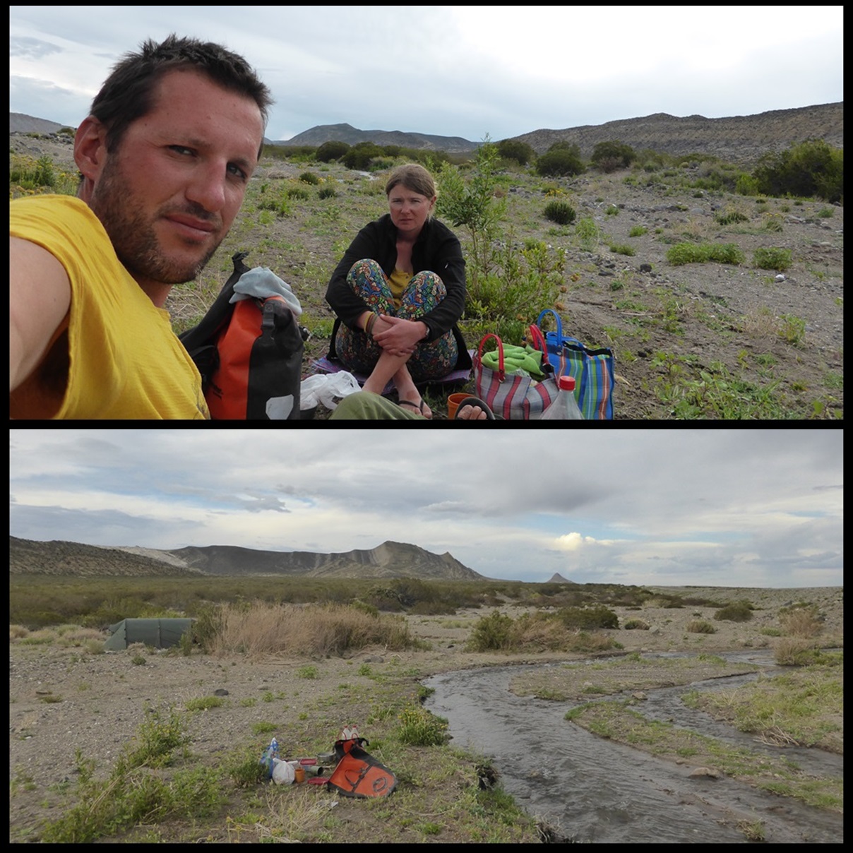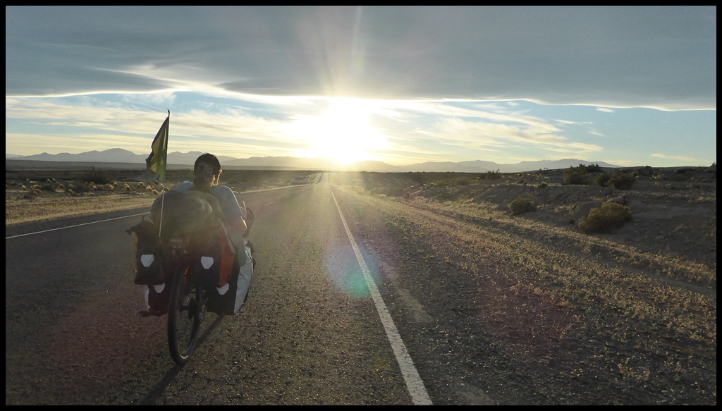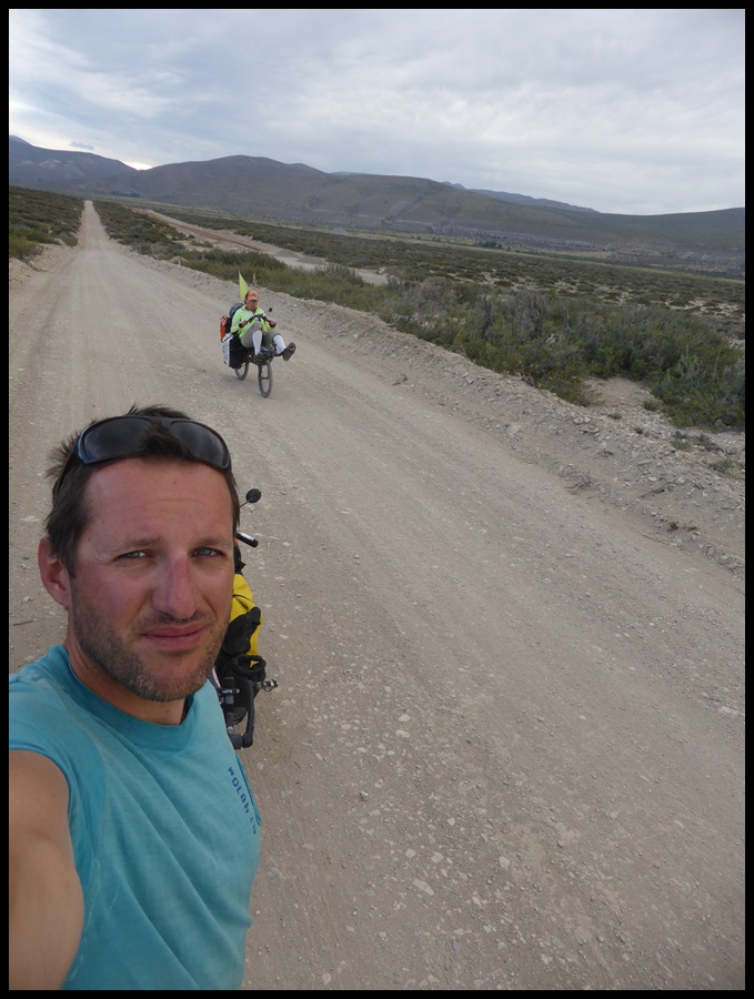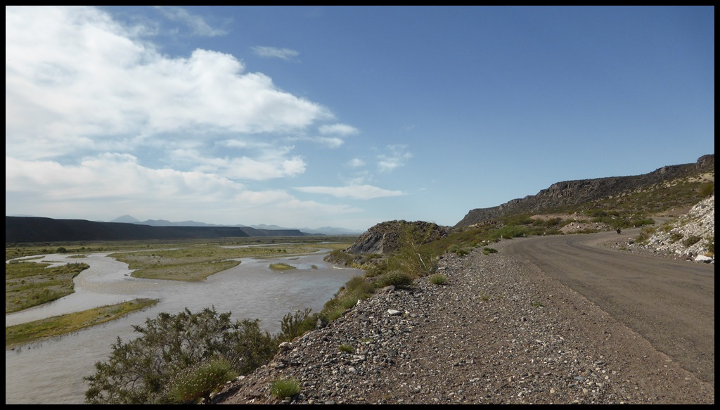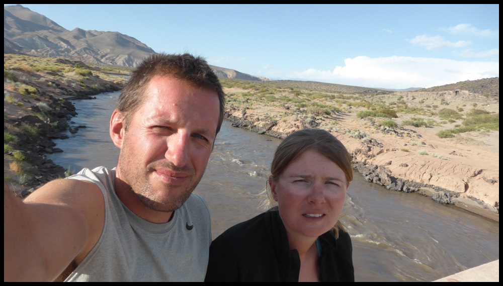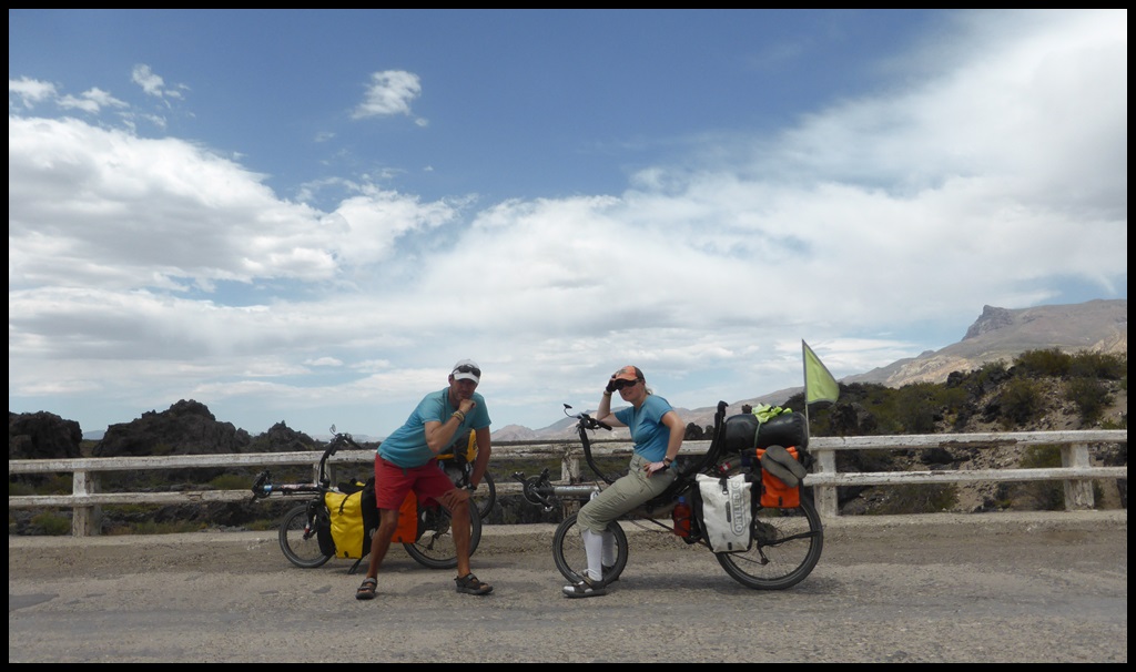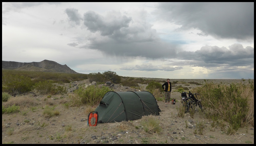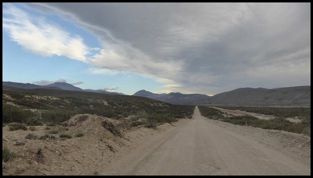 De Barrancas, on repart sur la route 40. Très peu de trafic, paysages toujours très secos mais on se plaît vraiment bien finalement sur ce parcours. Il ne fait pas extrêmement chaud et le constant vent de face nous rafraîchit, à défaut de nous aider. On se débrouille pour faire des pauses à l’ombre et même un beau petit bivouac le 1er soir au bord d’un ruisseau. Le temps se couvre et on passe une super soirée, seuls dans ces grands espaces.
