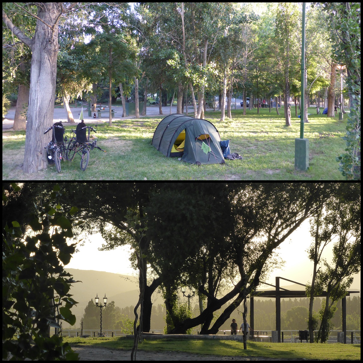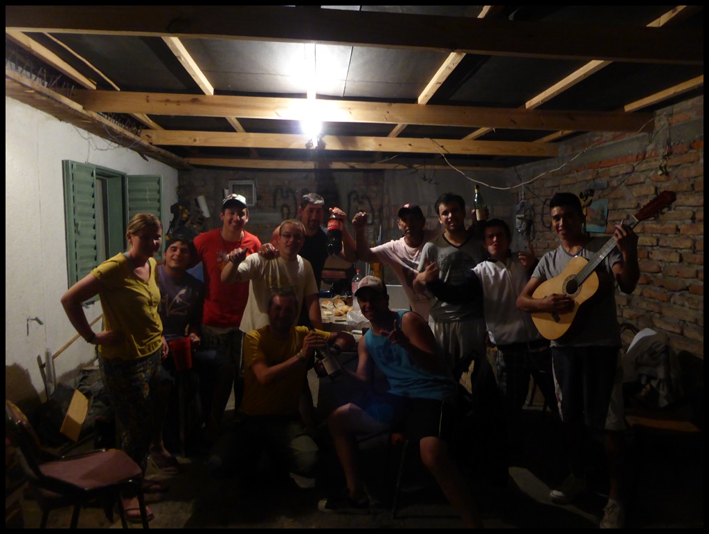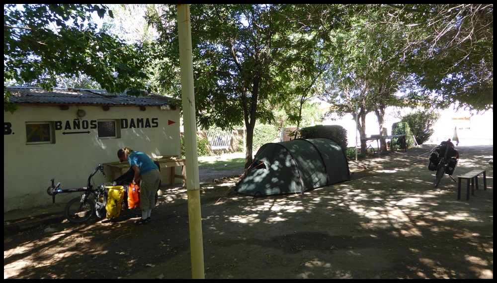 On arrive à 21h15. Juste avant de tourner vers le camping municipal, un groupe de jeune nous arrêtent et nous invitent pour l’asado. Là, tout d’un coup, ça va super. On oublie vite les 3 dernières heures. On monte la tente, on prend une bonne douche, on se fait une longue séance d’étirement et on rejoint nos amis. Saucisses, chansons à la guitare, Fernet-coca (fernet = alcool à base d’herbe, 40°) et discussions sur Maradona, Messi et Trezeguet. Les mecs sont un peu bourrés mais hyper sympas et bons guitaristes-chanteurs. On passe une super soirée en se demandant pourquoi il faut toujours faire 160 km pour être invité quelque-part.