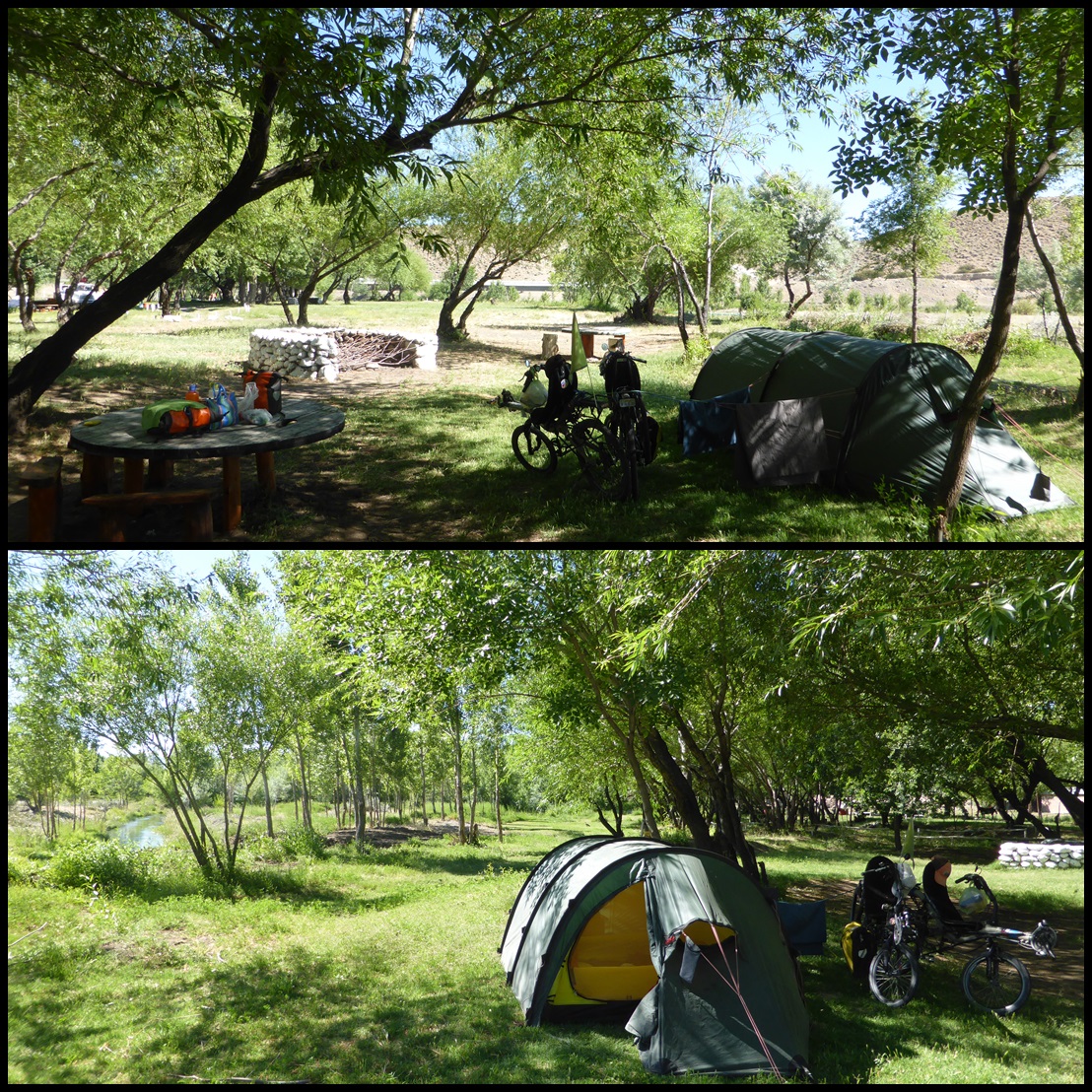 Le camping est sympa, on est presque seuls et, pour la 1ere fois depuis au moins 1000 ans, on monte la tente sur de l’herbe !! De la vrai, pas le truc pour lama qui transperce tout.