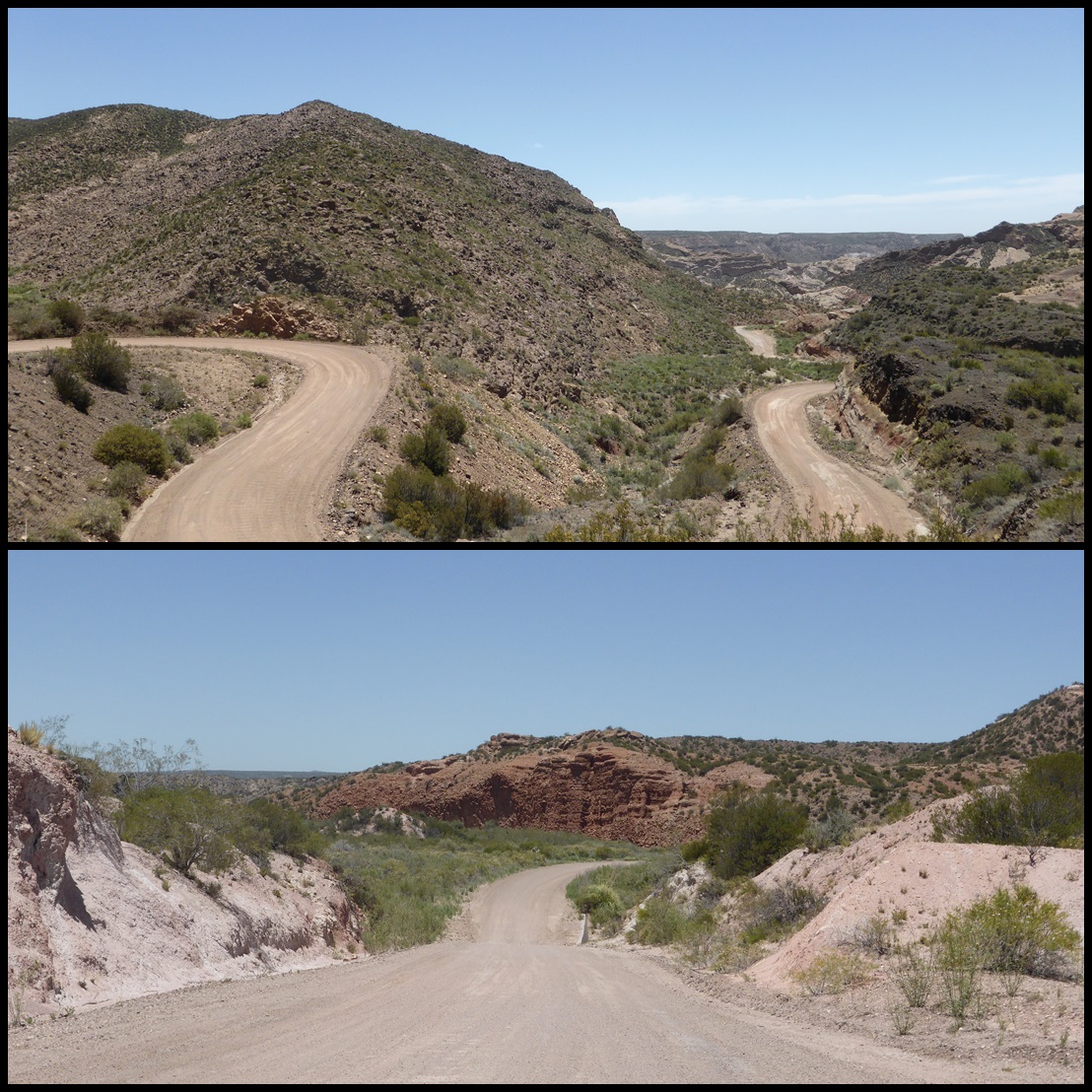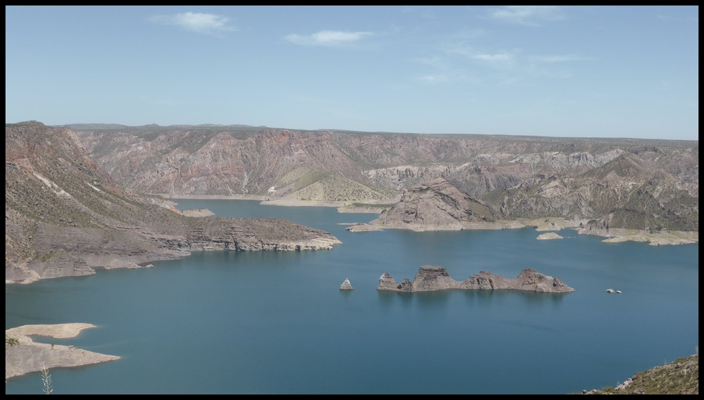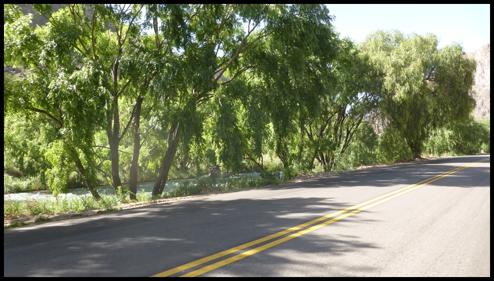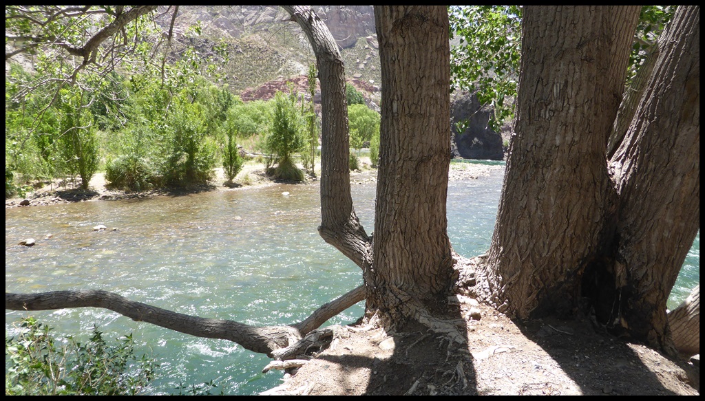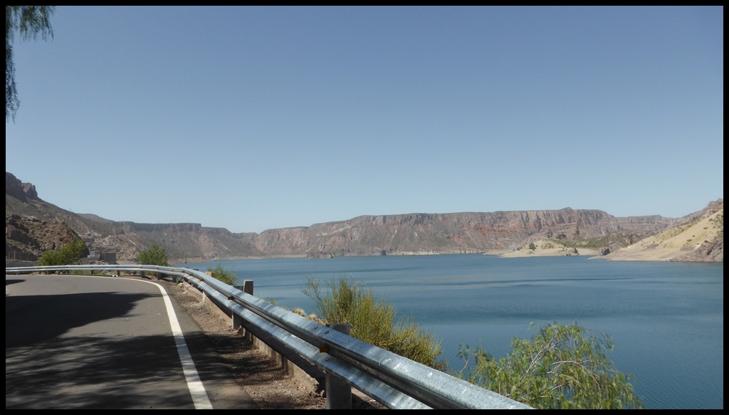 Avant 10h, on les a déjà fait. Nous sommes dans le rafraîchissant canyon d’Atuel. Très belle route au bord d’une eau bleue-grise mais dans notre grand classement des canyons, c’est loin de la 1ere place. On devient des gros cons blasés, je sais.