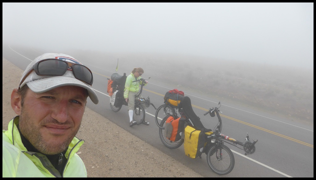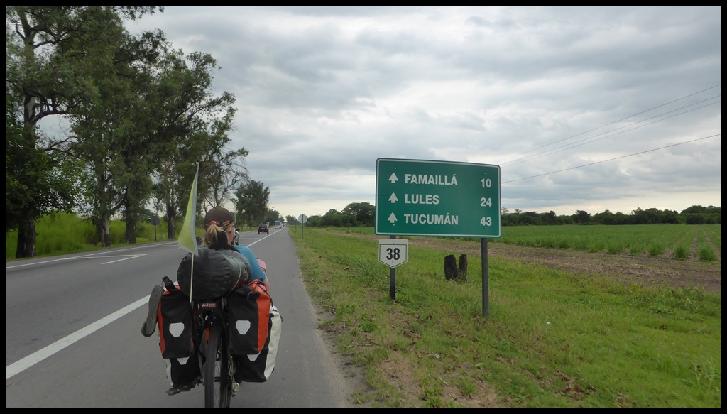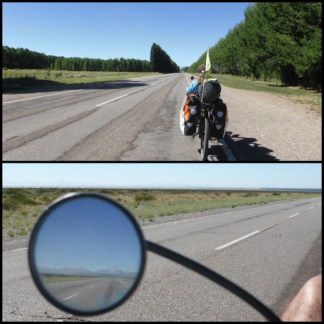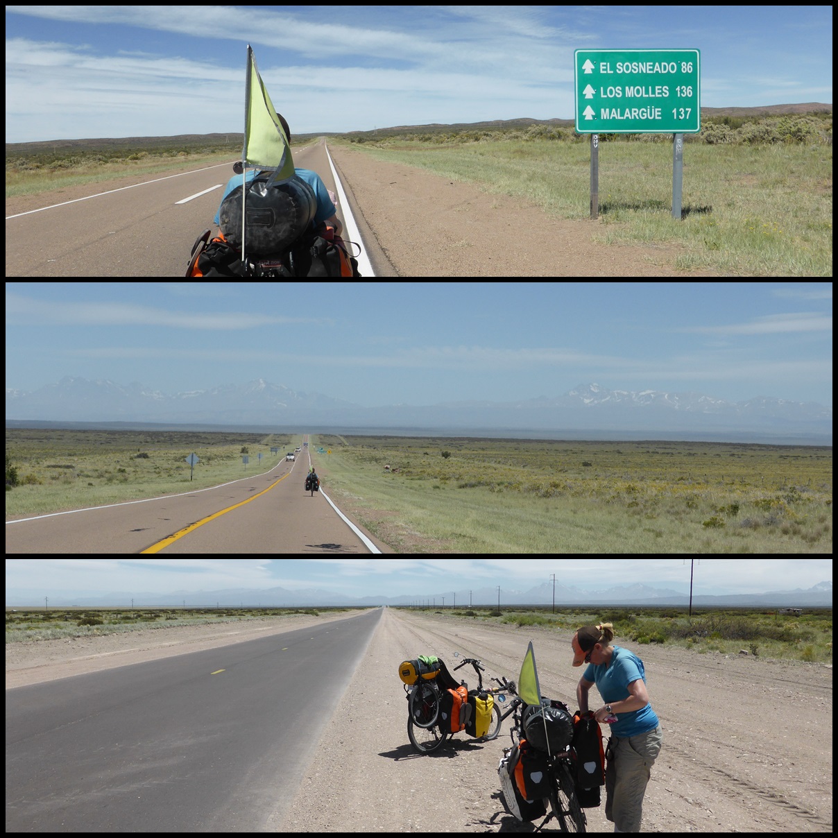 Le lendemain, on repart pour une grosse étape. Pas grand-chose à raconter : c’est plat, tout droit, on a le vent dans le dos une bonne partie et tout ce qu’il y a à voir, c’est les Andes enneigées en face. On ne fait qu’une mini-pause au bout de 75 km, juste le temps d’avaler nos tartines jambon-fromage-sable en bord de route, en plein vent et plein soleil, comme on aime.