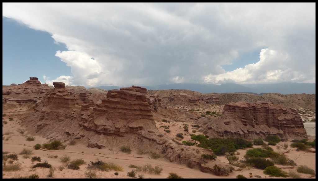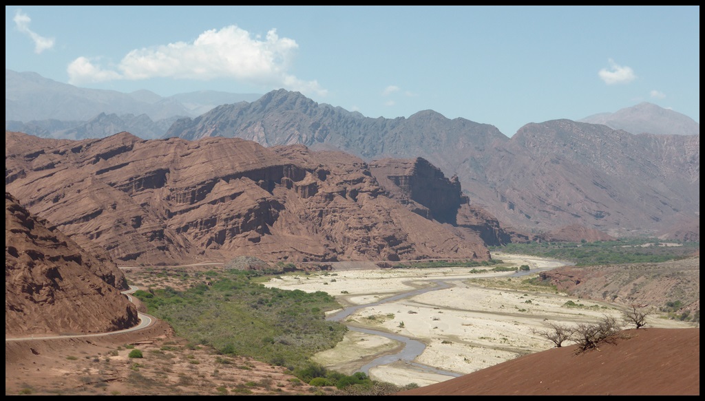 On part tôt pour éviter la chaleur et on attaque la spectaculaire Quebrada de las Conchas, la gorge d’une rivière presque à sec à cette période de l’année. Au détour d’un virage, un motard nous arrête pour une interview vidéo. J’espère recevoir son lien, vous pourrez admirer mon espagnol.
