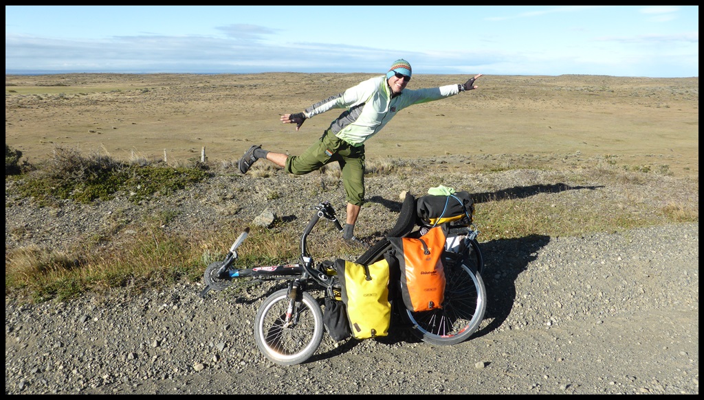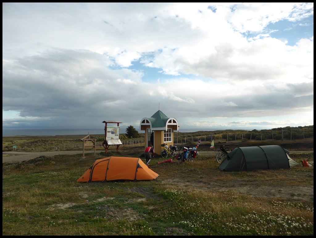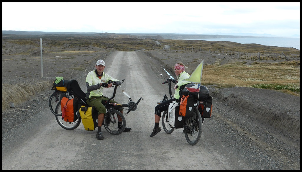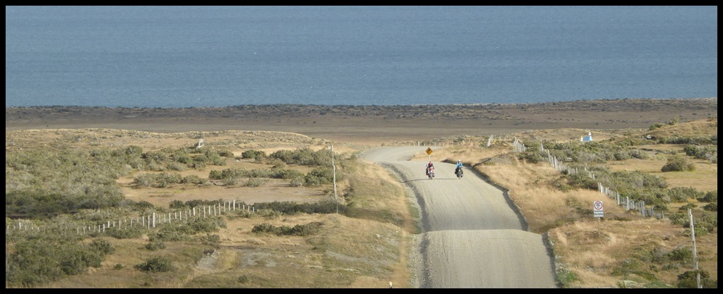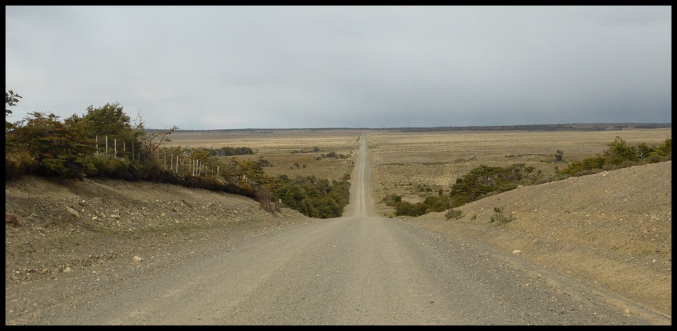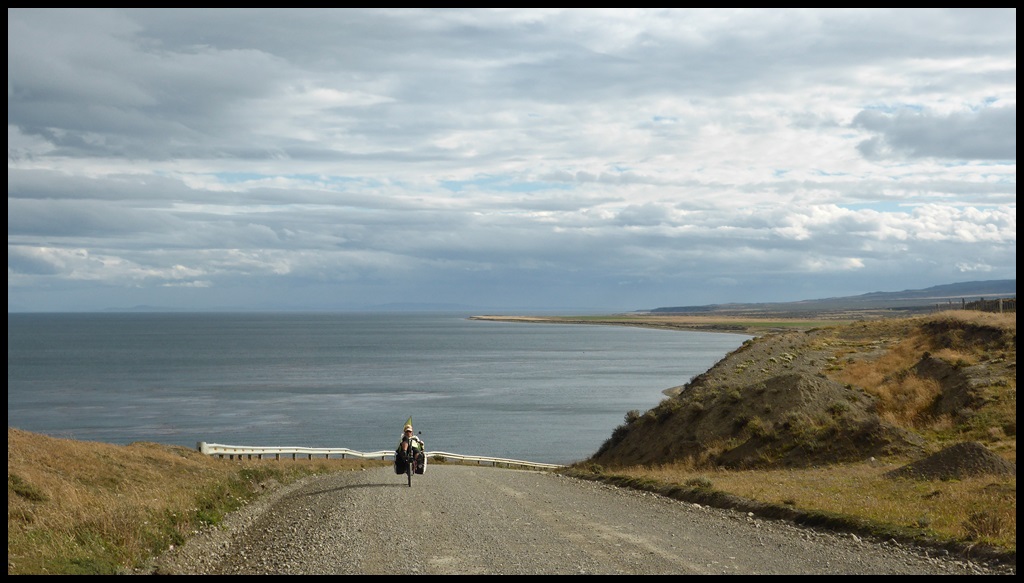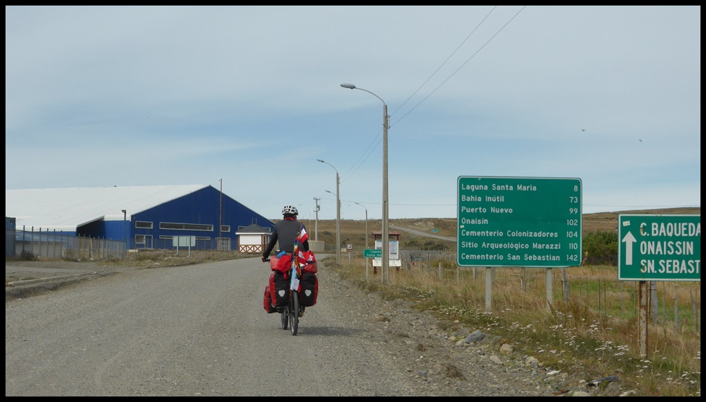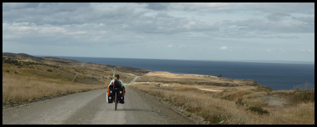 On débarque, roulons quelques kils jusqu’à Porvenir et mangeons. Bah oui, c’est souvent ça le voyage à vélo. Au bout de 10 mois, vous avez dû comprendre qu’on fait presque que pédaler et manger. Ça y est, on est en Terre de Feu. Bye bye le bitume, c’est parti pour 4 jours de piste. Attention, de la piste de compet’ , bien roulante et avec très très peu de caillasse et de tôle ondulée.