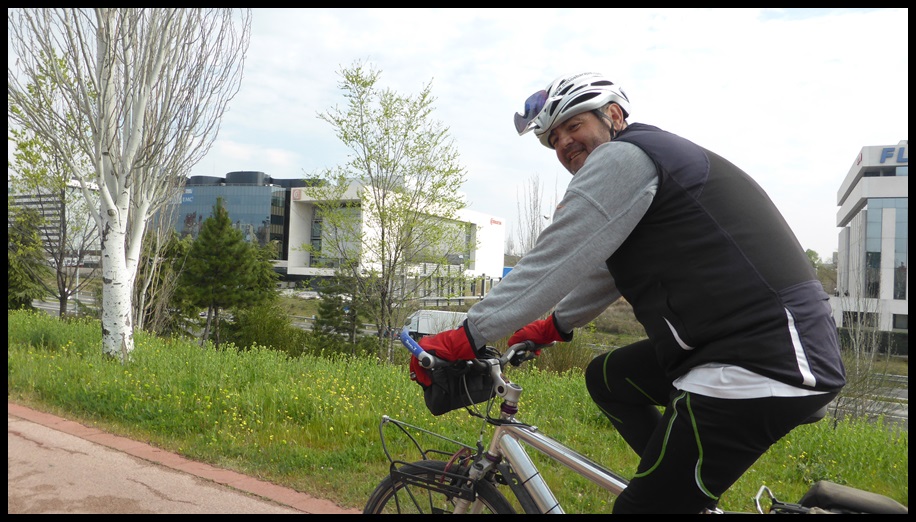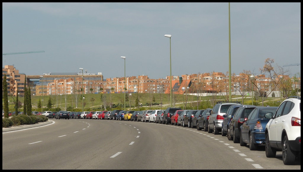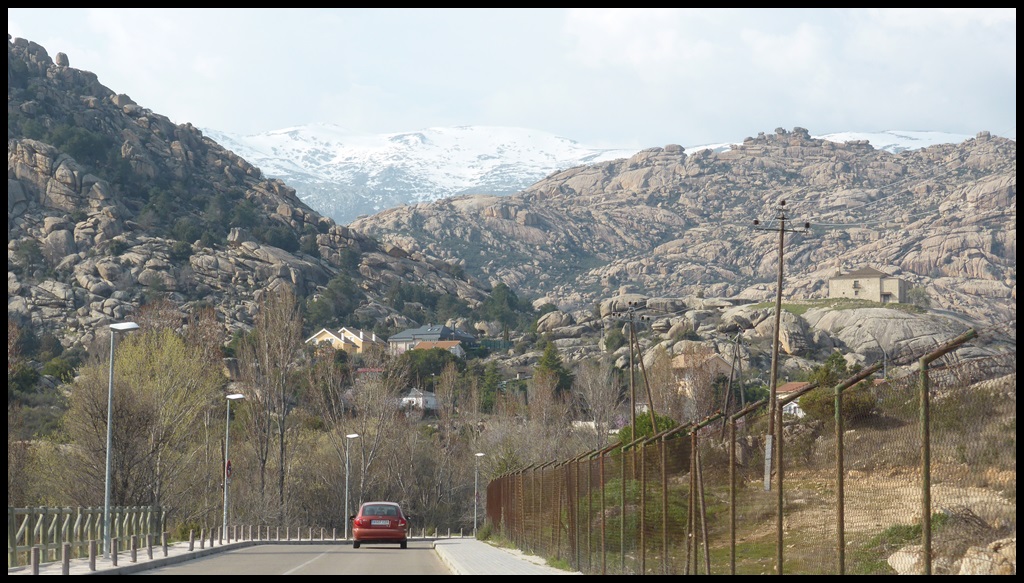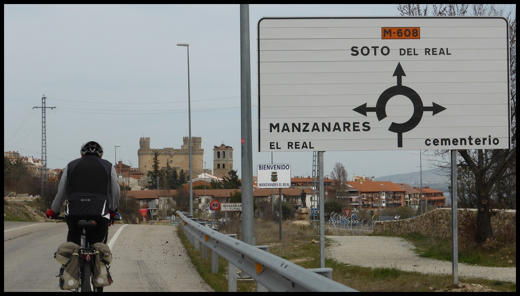 On passe par des pistes cyclables, dont celle qui fait le tour de Madrid sur 64 km. Ensuite, on en prend une qui va vers le nord. Ça monte, ça descend et on se fait griller par les très nombreux cyclos et leur vélos carbone. Cette piste est la seule bonne chose car les paysages sont horribles : que des routes, des lignes électriques et des banlieues dortoirs à moitié vides dans lesquelles je me taperais la tête contre les murs si j’y logeais.