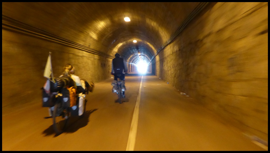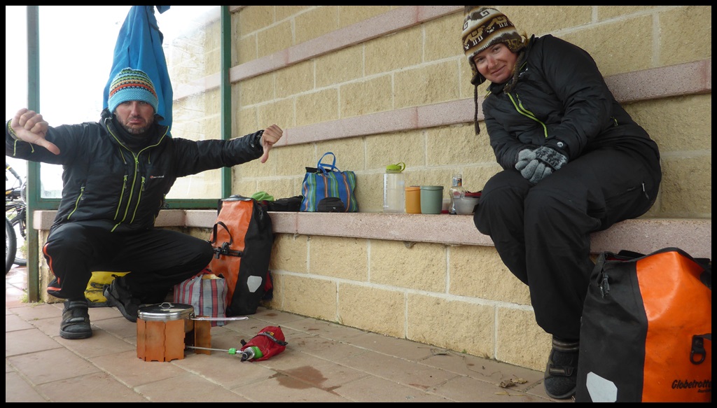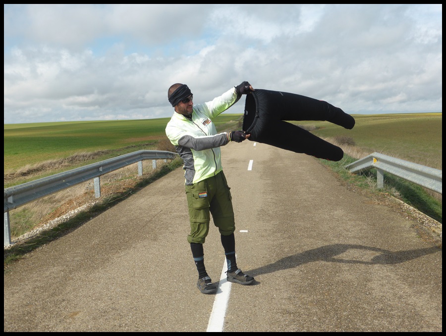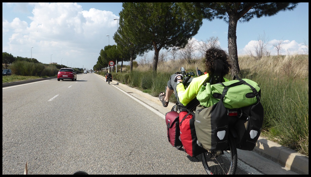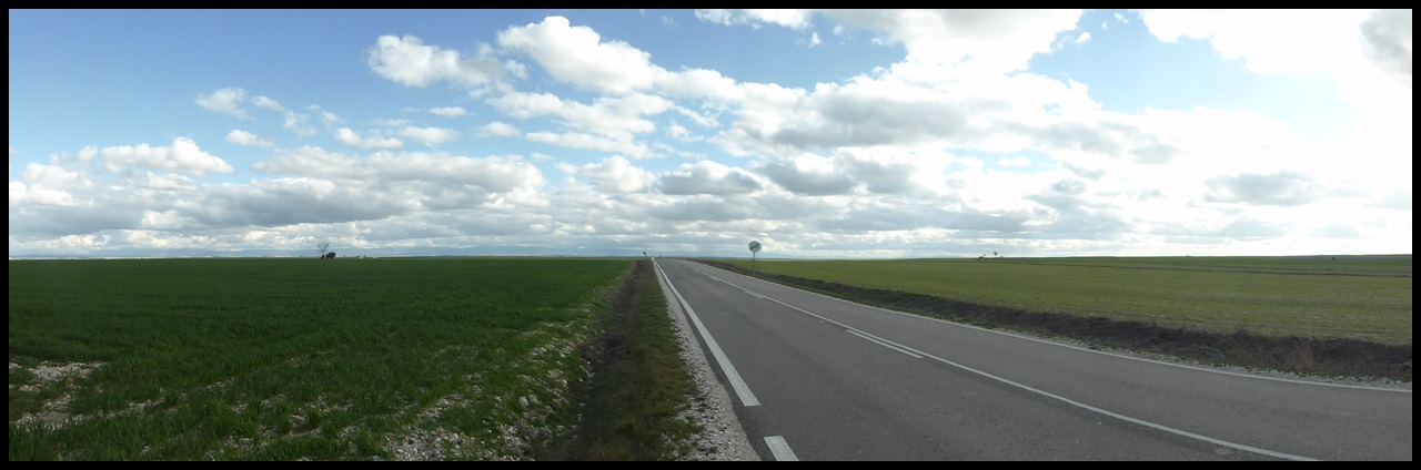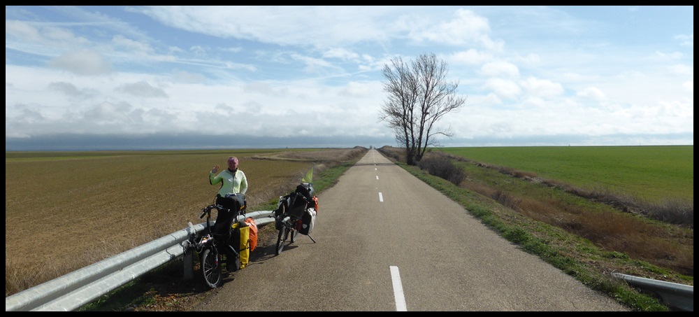 On se fait 3 étapes très éprouvantes. 3 jours de vent très fort, entre 60 et 80 km/h en continue, en provenance de l’ouest ou du nord-ouest. De face, de ¾ ou de côté dans le meilleur des cas. 3 jours de froid avec une température ressentie négative la plupart du temps. Une nuit, en bivouac, il fera 0°C sous la tente. Bivouac mémorable d’ailleurs : on s’était posé dans une mini-forêt à 500m d’un élevage porcin. A part l’odeur de lisier, c’était un coin sympa, le seul à l’abri du vent à 30 km à la ronde. Et a part les cris des cochons que des gars chargeaient dans un camion à 3 heures du mat un samedi soir, Ophélie n’aurait pas flippé et on aurait super bien dormi. Pour nous venger, on mangera plein de chorizo.