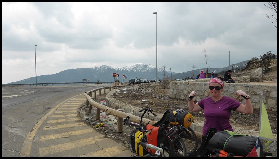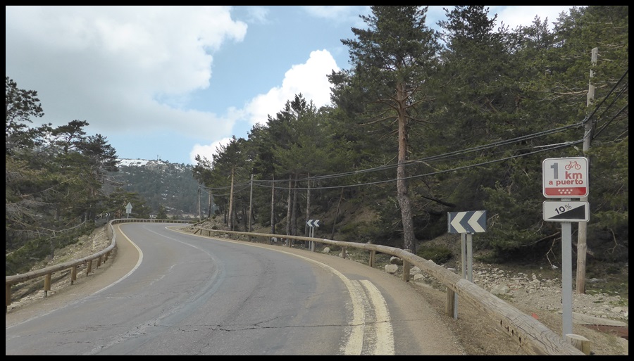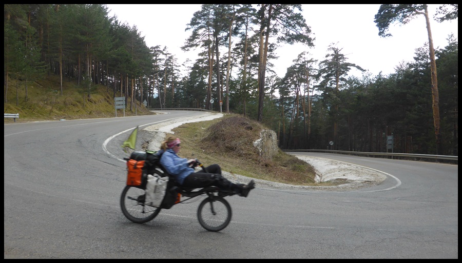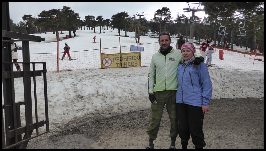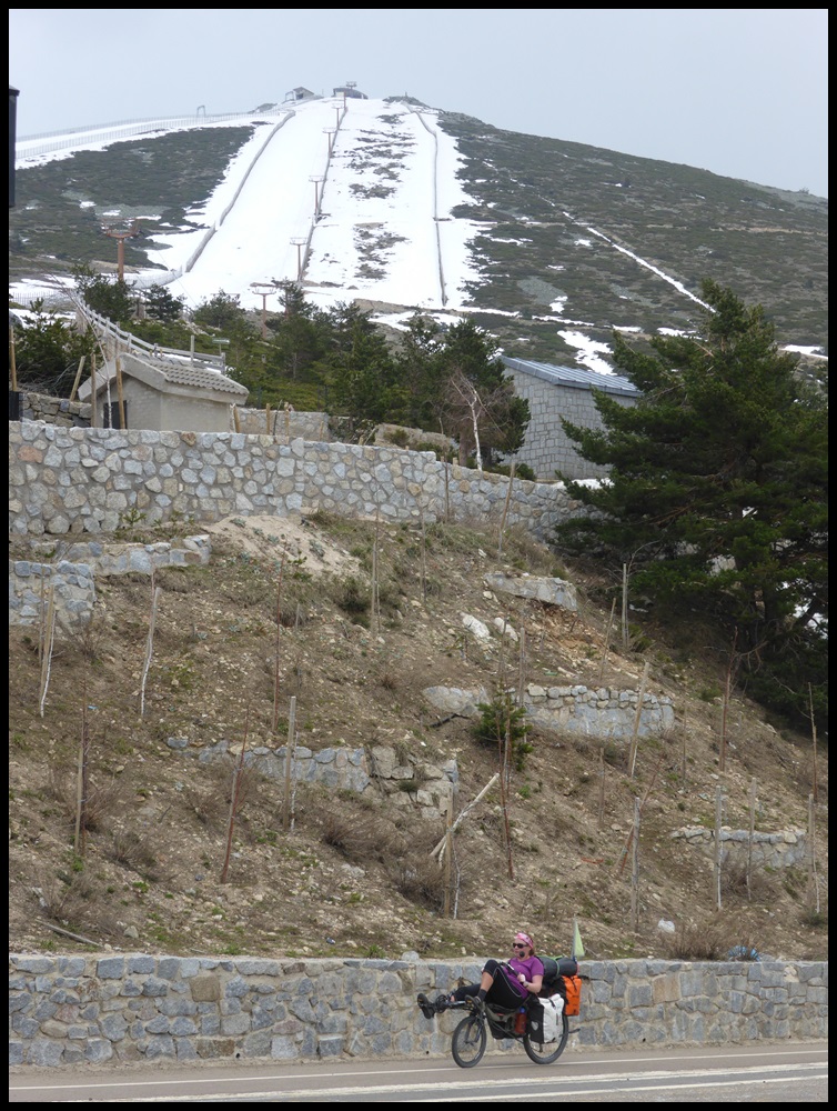 On s’attaque à un col que Juan Carlos nous avait décris comme hyper balèze et glacial. Mouais, ça monte tranquille sans dépasser du 8 %, sur un beau goudron. On arrive en haut en short et t-shirt au milieu des skieurs, il fait 9°C, nous sommes à 1860 m. Excellent.